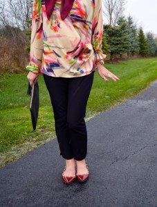 As for the outfit – easy breezy and comfortable is my motto for Thanksgiving. I generally like to keep it simple with my Thanksgiving day look because I want to stuff my face with food. In addition I had to run around and get stuff done therefore I kept it simple with black pants, patterned top, flats, and my new favorite Haute Hijab cranberry scarf. I’m in love with this Anthro top because it is a brushstroke of autumn colors and screams Thanksgiving to me!