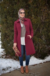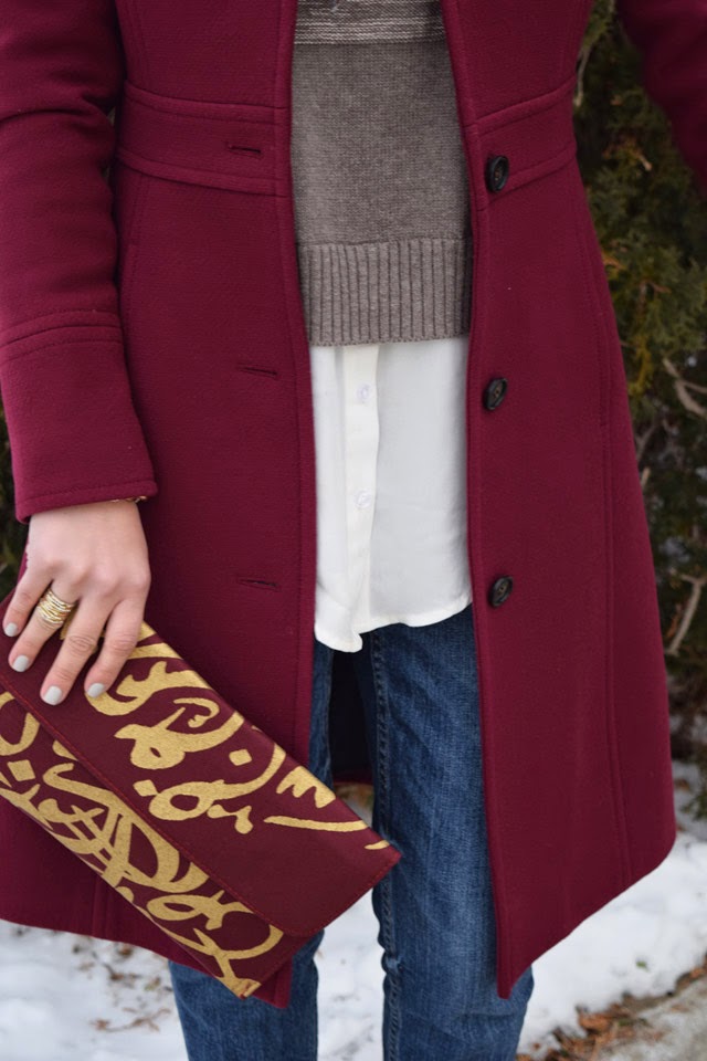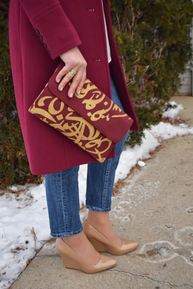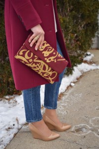 This coat is on major repeat these days. Pantone announced the color of the year as Marsala and I am super happy with that because I have a ton of Marsala colored items! This look is my typical recipe for a dinner with the girls – jeans, sweater, heels, statement coat, and clutch! Super simple and super stylish!