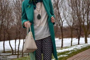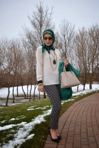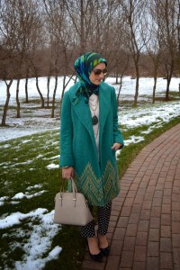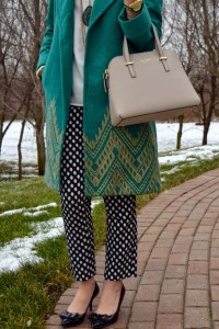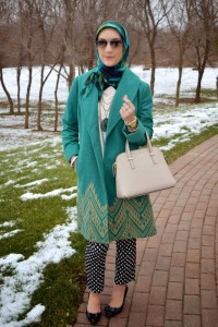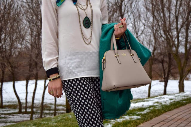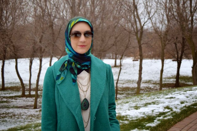 Coat: Anthropologie | Blouse: The Limited (old) | Pants: Banana Republic | Scarf: Haute Hijab | Shoes: DSW | Bag: Kate Spade | Sunnies: Ray-Ban | Necklace Gift | Watch: Michael Kors | Bangles: BCBG (old) | Lips: M.A.C. Hot Tahiti