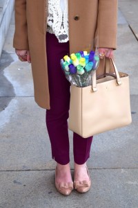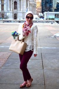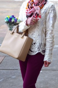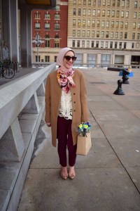 Coat: J. Crew | Blouse: The Limited | Crochet Top: Chicwish | Pants: Banana Republic | Scarf: Haute Hijab | Neck Scarf: Haute Hijab | Shoes: J. Crew Factory | Sunnies: Cole Haan | Bag: Kate Spade | Watch: Michael Kors | Ring: Stella & Dot | Bracelet: BaubleBar (old) | Lips: M.A.C. Girl About Town