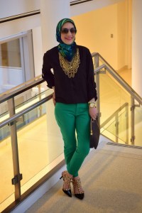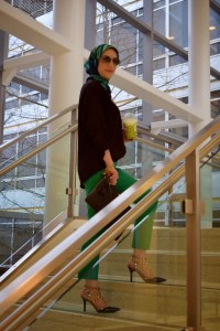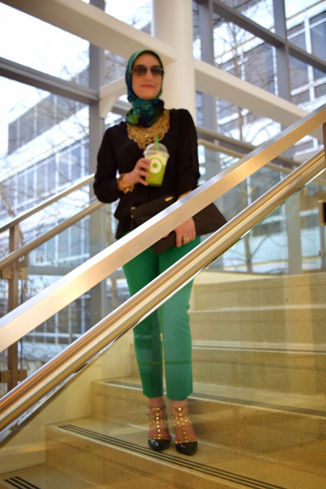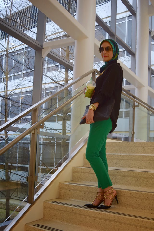 Happy St. Patrick’s Day! My St. Patty’s tradition is to put on these obnoxiously green pants, grab a green tea frap from Sbux and pile on the gold jewelry. This Haute Hijab Tropical Jungle Scarf (last seen here and here) is my all time favorite and lucky charm green scarf. I landed my internship wearing this lucky scarf.