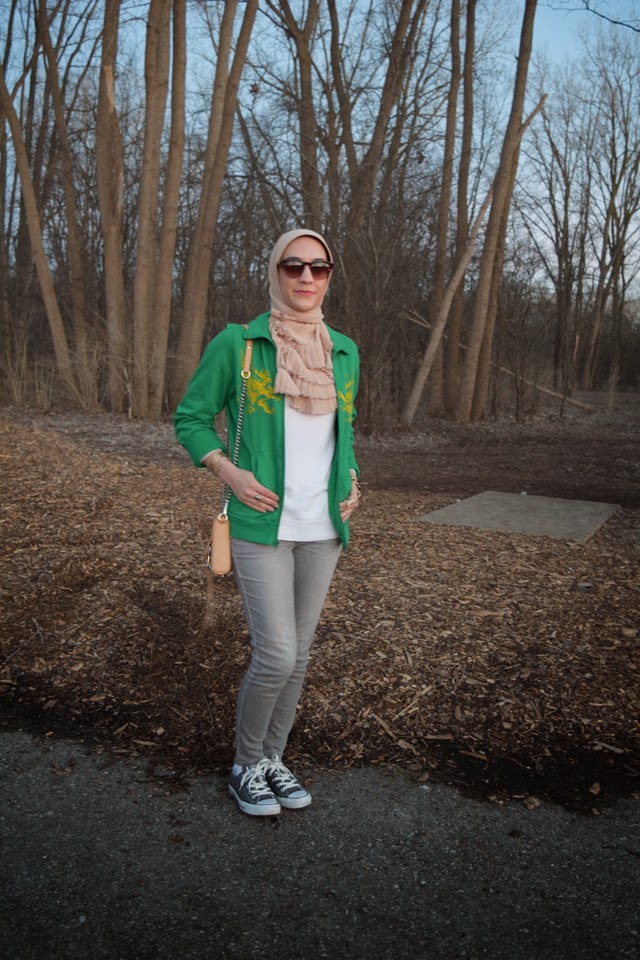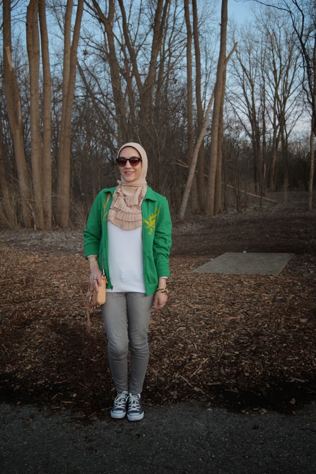 Jacket: NIMANY | Sweater: The Limited (old) | Jeans: The Limited | Scarf: Vela | Shoes: Converse | Bag: Rebecca Minkoff | Watch: Michael Kors | Sunnies: Cole Haan | Flash Tattoos: Zahra | Lips: YSL #17