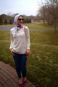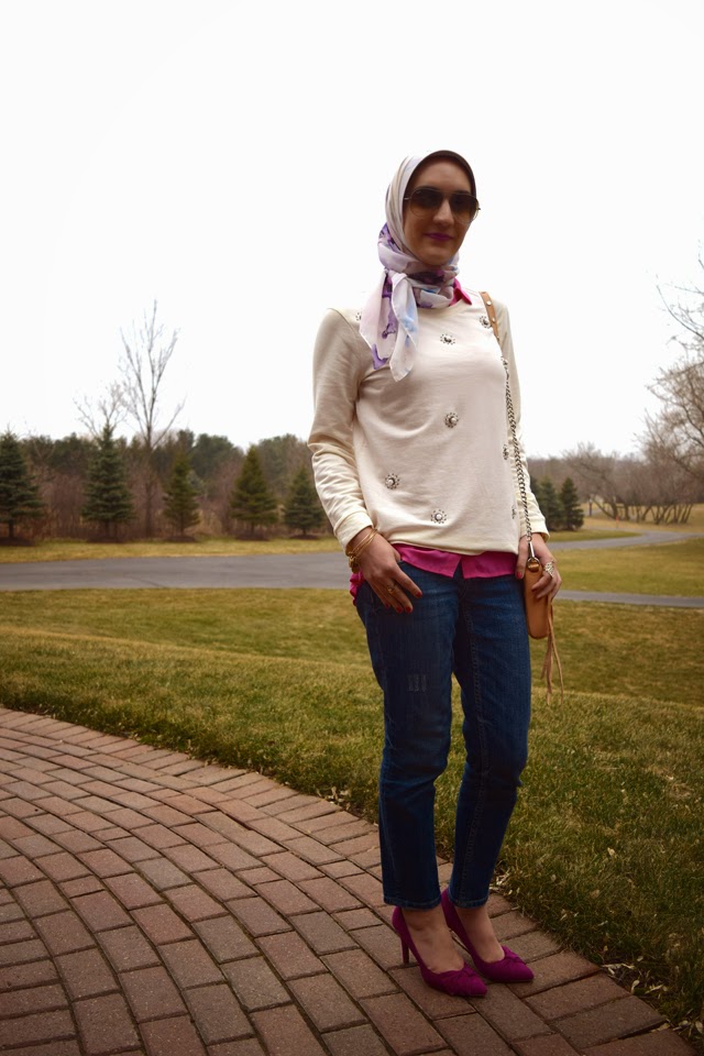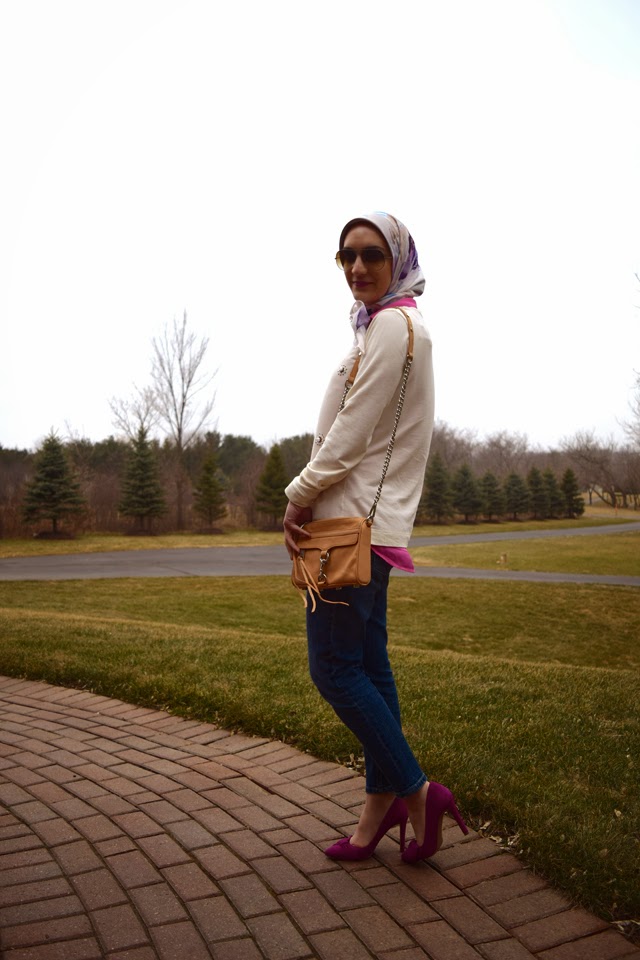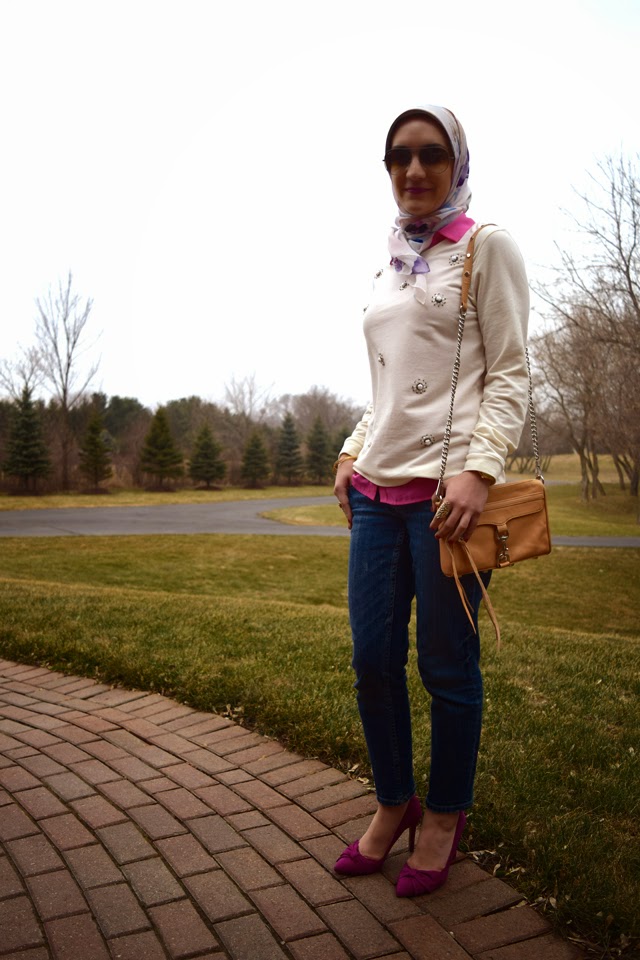 Sweater: Banana Republic (old) (similar) | Blouse: The Limited | Jeans: The Limited | Scarf: Haute Hijab | Sunnies: Ray-Ban | Shoes: DSW (old) (similar) | Bag: Rebecca Minkoff | Watch: Michael Kors | Bracelet: Alex & Ani | Lips: M.A.C. Up the Amp