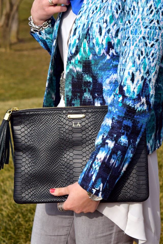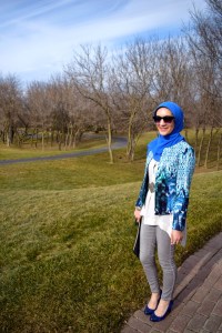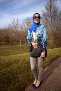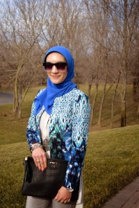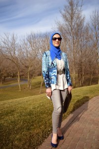 Jacket: H&M (old) (similar) | Tank: H&M (old) | Jeans: The Limited | Scarf: Haute Hijab | Clutch: GiGi NY | Sunnies: Cole Haan | Watch: Michael Kors | Belt: Anthropologie (similar) | Ring: BaubleBar | Shoes: Ralph Lauren via Macy’s (similar) | Lips: M.A.C. Velvet Teddy