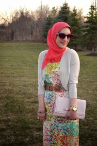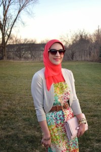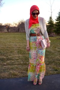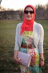 Dress: The Limited (old) (similar here and here) | Bolero: The Limited | Scarf: Haute Hijab | Clutch: Ted Baker | Sunnies: Cole Haan | Shoes: Tahari via DSW | Belt: Anthroplogie (old) | Watch: Michael Kors | Bangles: Forever 21 | Lips: M.A.C. Vegas Volt