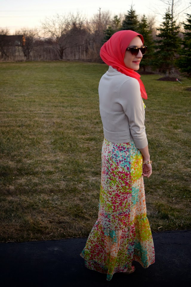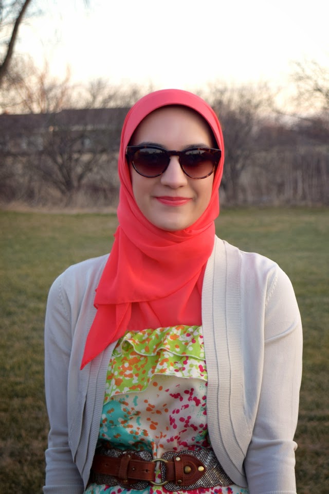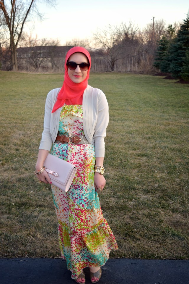 Dress: The Limited (old) (similar here and here) | Bolero: The Limited | Scarf: Haute Hijab | Clutch: Ted Baker | Sunnies: Cole Haan | Shoes: Tahari via DSW | Belt: Anthroplogie (old) | Watch: Michael Kors | Bangles: Forever 21 | Lips: M.A.C. Vegas Volt