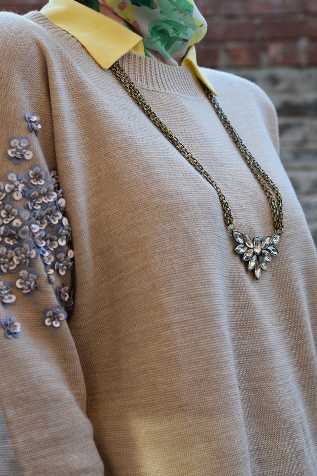 Sweater: J. Crew | Blouse: The Limited | Jeans: The Limited | Scarf: Zeena | Shoes: J. Crew Factory | Bag: Kate Spade (similar) | Sunnies: Ray-Ban | Necklace: c/o Rocksbox | Bracelet: c/o Rocksbox | Ring: c/o Rocksbox | Watch: Michael Kors | Lips: M.A.C. Vegas Volt