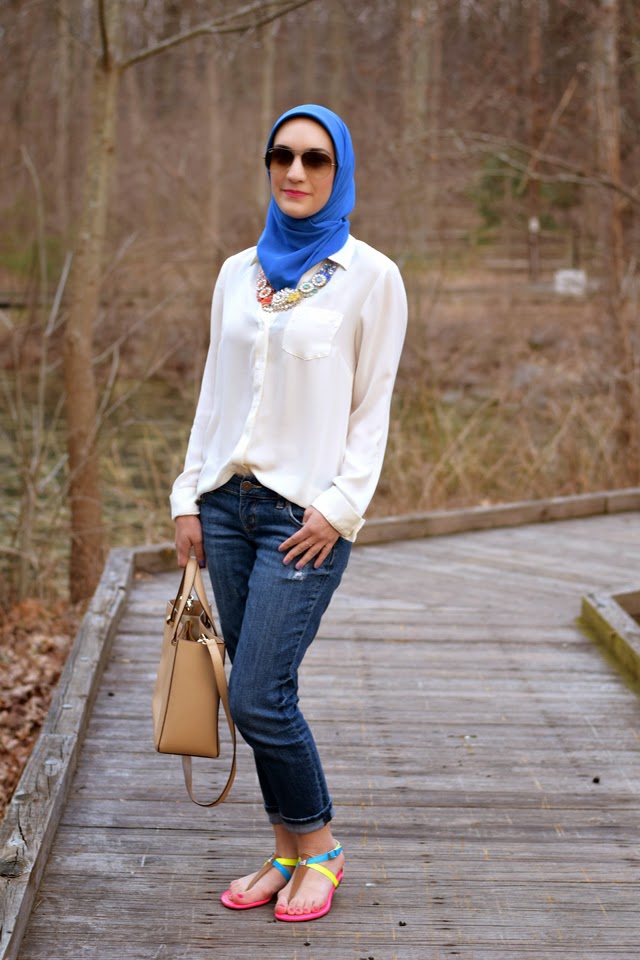 Jeans: The Limited | Blouse: The Limited | Scarf: Haute Hijab | Sandals: Sperry | Bag: Kate Spade | Necklace: BaubleBar (similar) | Sunnies: Ray-Ban | Watch: Michael Kors | Bangles: Alex & Ani | Rings: Visible Interest and Stella & Dot | Lips: M.A.C. Girl About Town