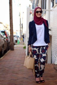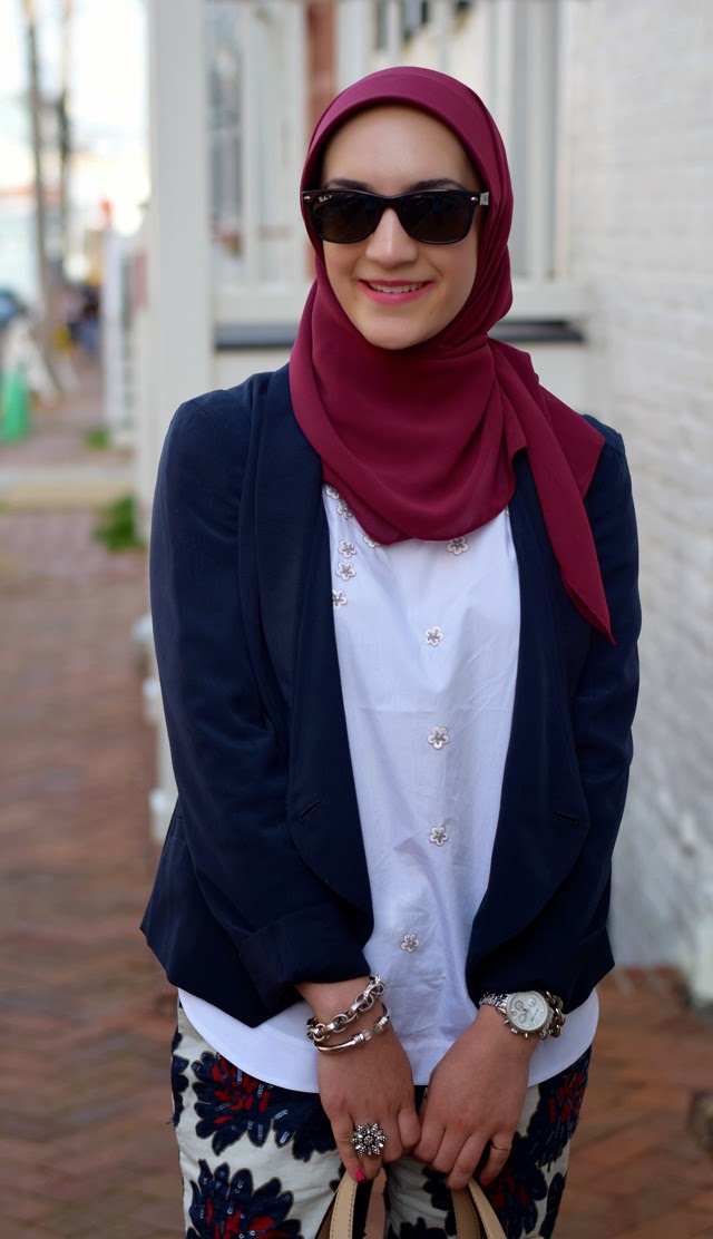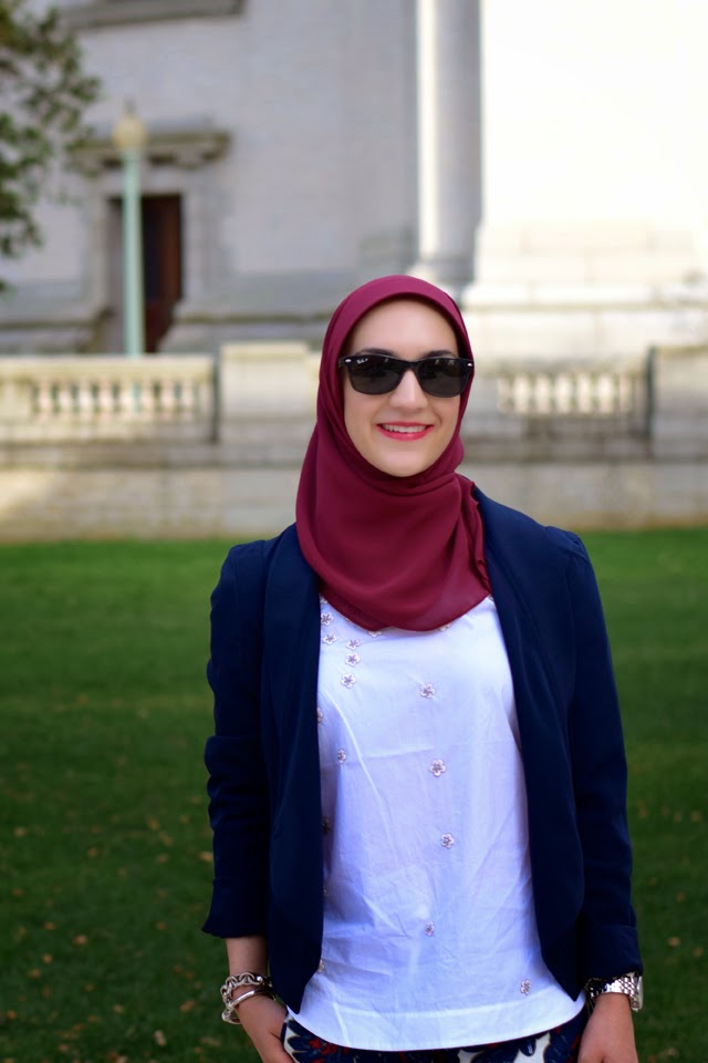 Blazer: The Limited (old) (similar) | Top: J. Crew | Pants: J. Crew | Scarf: Haute Hijab | Shoes: Banana Republic | Bag: Kate Spade | Sunnies: Ray-Ban | Watch: Michael Kors | Bangles: BaubleBar | Ring: Rocksbox | Lips: YSL #17 Rose in Tension