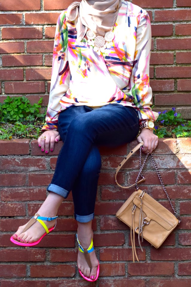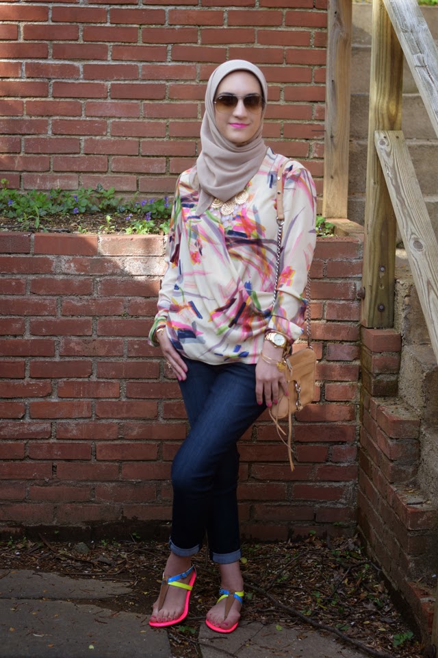 Top: Anthropologie (sold out) | Jeans: The Limited | Scarf: Haute Hijab | Sandals: Sperry (old) | Bag: Rebecca Minkoff | Sunnies: Ray-Ban | Watch: Michael Kors | Bracelet: Rocksbox and Alex & Ani | Lips: M.A.C. Candy Yum Yum