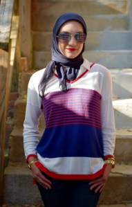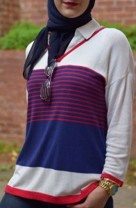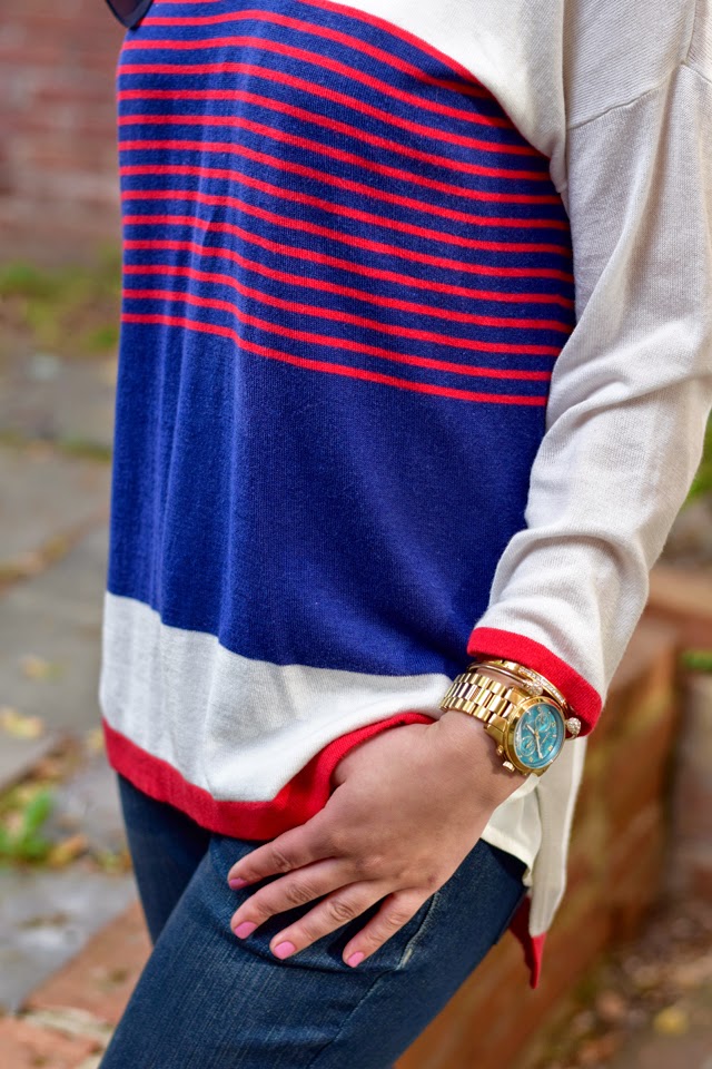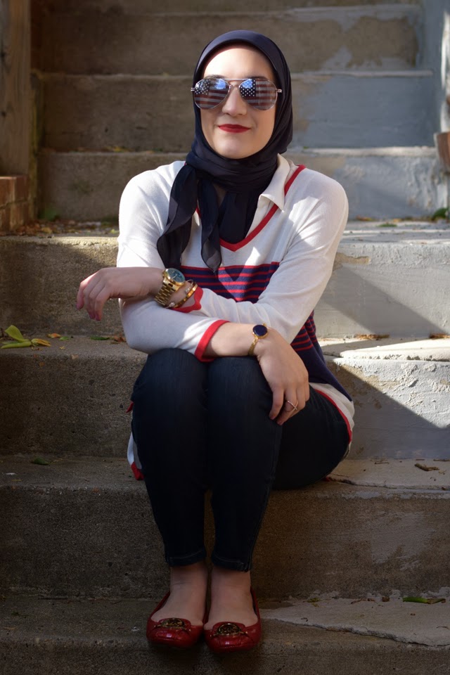 Sweater: The Limited (old) (similar) | Blouse: The Limited | Jeans: The Limited | Scarf: Haute Hijab | Sunnies: Nordstrom | Shoes: Michael Kors (similar) | Clutch: GiGi NY | Watch: Michael Kors | Ring: BaubleBar | Lips: Stila Beso