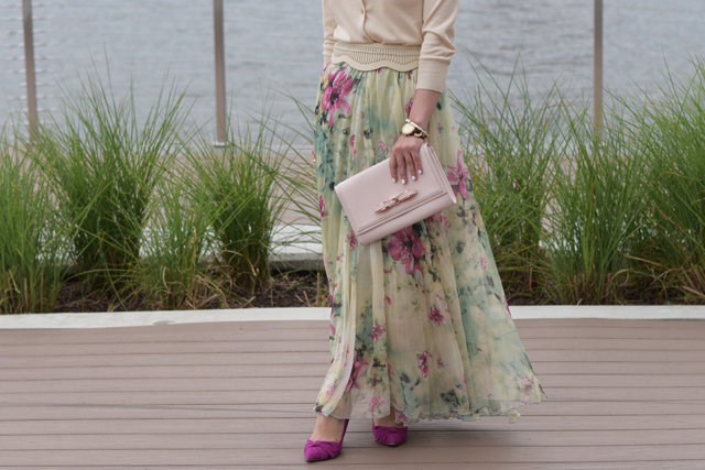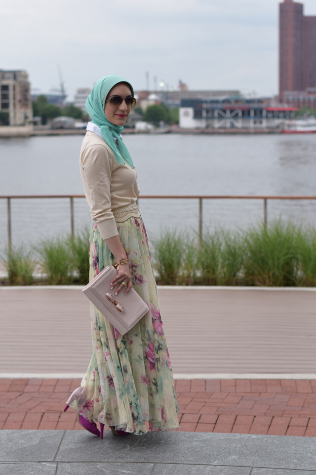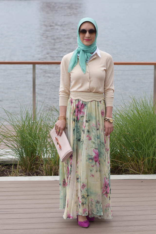Cardigan: J. Crew Factory | Collar Shirt: Haute Hijab | Skirt: Chicwish | Belt: BCBG | Scarf: Haute Hijab | Shoes: DSW (old) | Sunnies: Ray-Ban | Watch: Michael Kors | Bangle: Alex and Ani | Clutch: Ted Baker (similar) | Lips: M.A.C. Girl About Town