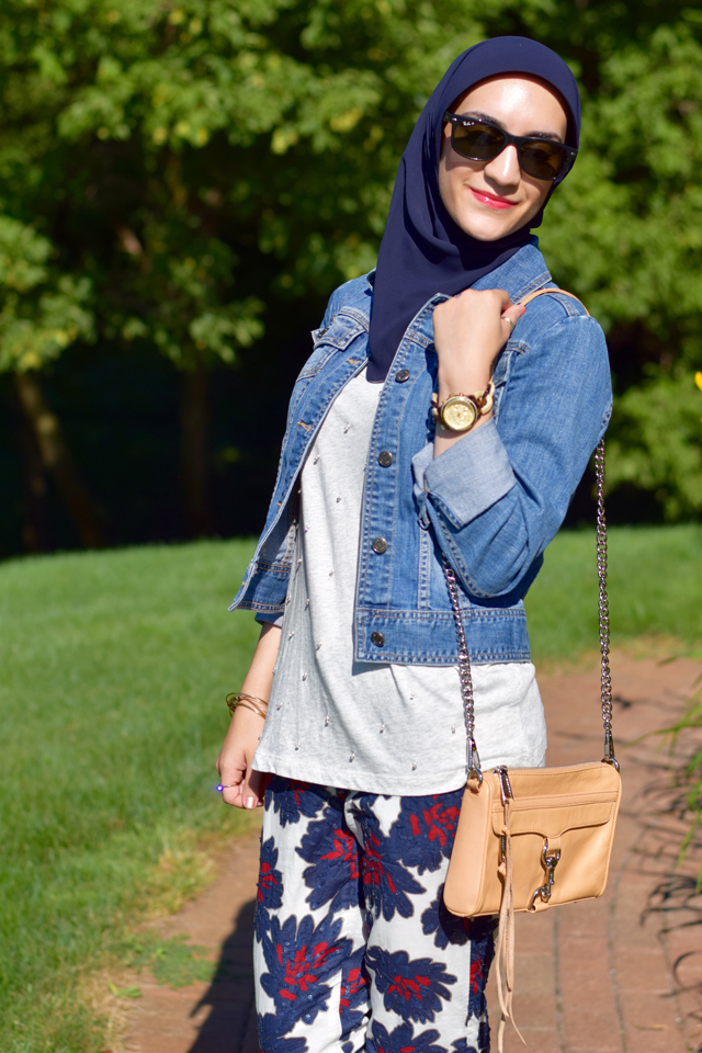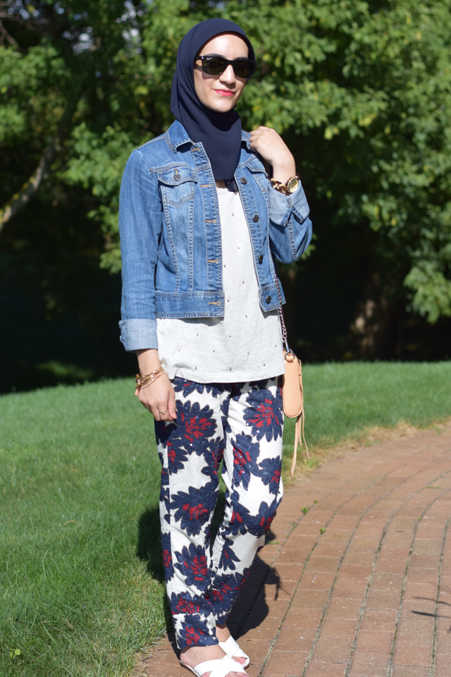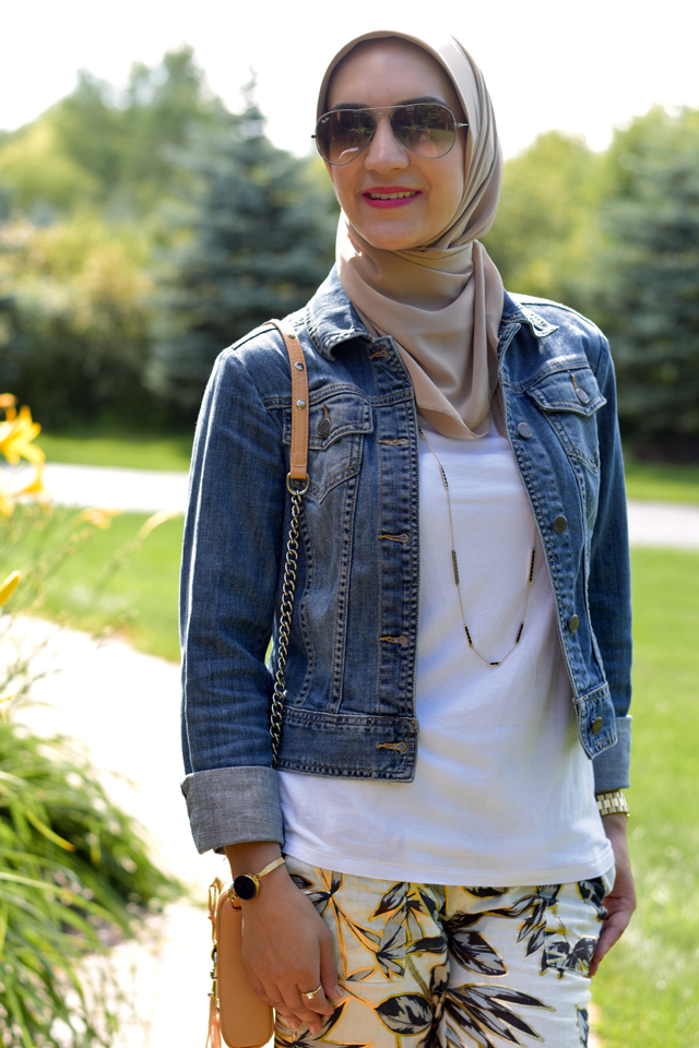 Today I’m sharing one of my go to looks to style printed pants! A super easy way to style printed pants is to pair a tee + denim jacket! You can never go wrong with this combo. If the weather is too hot for a jacket then I would go the route of pairing the pants with a chambray top! I personally like to add a few accessories such as a layered necklace, bangles, neutral bag, and bright lipstick! For my hijabis – pair a solid color scarf that picks up the print in the pant to finish off the look. As for the shoes – it all depends what the occasion is. From my looks you can see I paired it with sandals, converse, and heels! All three of these looks work perfectly for the summer time – whether it be lunch with the girls, traveling, sightseeing, or running errands!