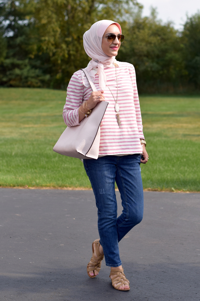 Top: J. Crew | Blouse: The Limited | Jeans: The Limited | Scarf: Haute Hijab | Tote: Nordstrom | Sandals: Nordstrom (similar here and here) | Sunnies: Ray-Ban | Necklace: Kendra Scott | Watch: Michael Kors | Ring: Birchbox | Bangles: Alex & Ani | Lips: M.A.C. Girl About Town
