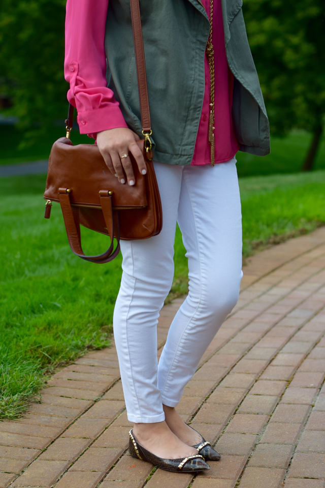 One of my favorite pieces for transitioning from summer to fall is a olive color vest! They are extremely versatile and surprisingly pair well with a lot of colors. This week I will share two looks with this vest to show you how versatile it is and that it is a closet staple! Sometimes it’s hard to style this vest without going borderline safari exhibition tour guide – in order to avoid that I pair it with feminine pieces. This look is more on the feminine side – I paired the vest with a pink blouse, white jeans, gold accessories, and pointed flats.