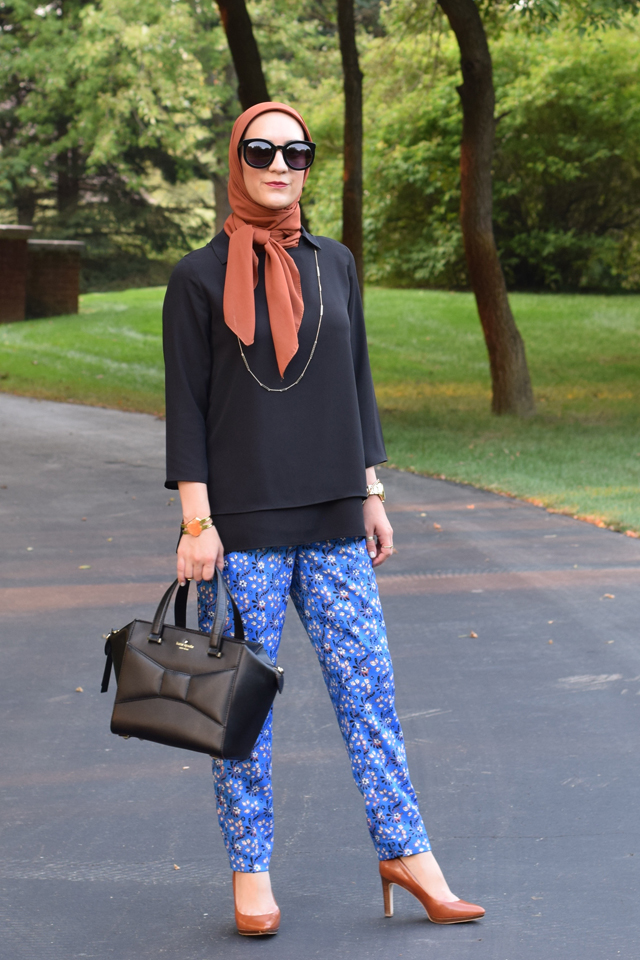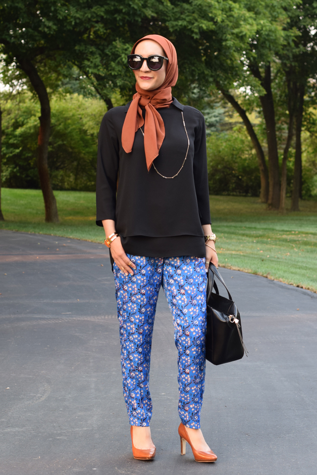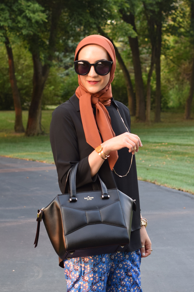 It’s no secret I’m a lover of printed pants (last post here)! These pants scream fall and happen to be super comfortable. Honestly pants shouldn’t be this comfortable and look so good! Since there is a lot of color going on with these pants I decided to keep the rest of my look neutral – black top – and pair it with a solid color scarf in the print to tie the look together. Although I have a feeling I will be pairing these pants with a strip turtleneck and a denim jacket in a few weeks!