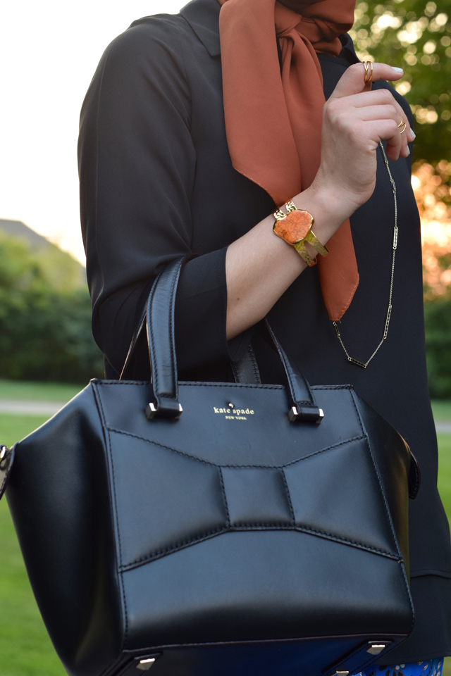 Blouse: The Limited (similar with collar) | Pants: J. Crew | Sunnies: Karen Walker | Shoes: Franco Sarto ((similar here and here) | Bag: Kate Spade (similar) | Necklace: House of Harlow | Cuff: Rocksbox | Watch: Michael Kors | Lips: NARS Audrey