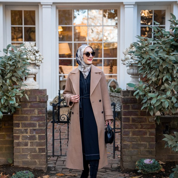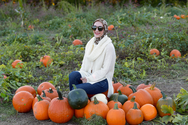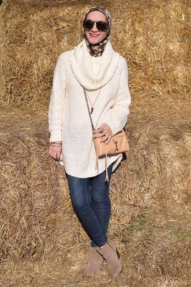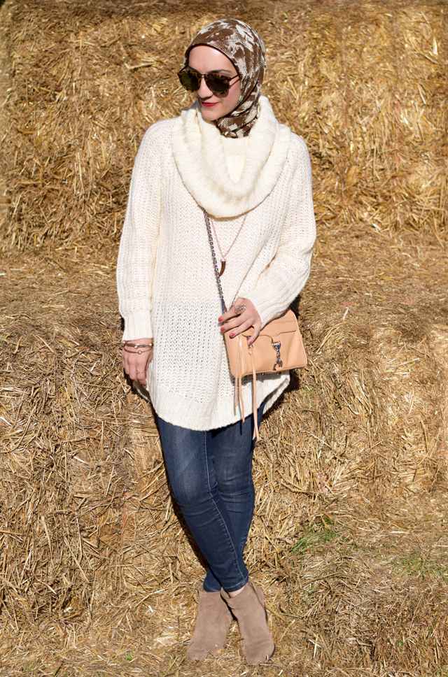Sweater: Nordstrom | Jeans: Banana Republic | Scarf: Haute Hijab | Booties: Sam Edelman (similar) | Bag: Rebecca Minkoff | Sunnies: Karen Walker | Necklace: BaubleBar | Lips: Stila Beso