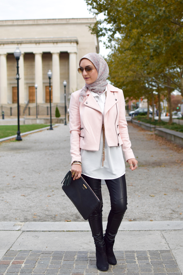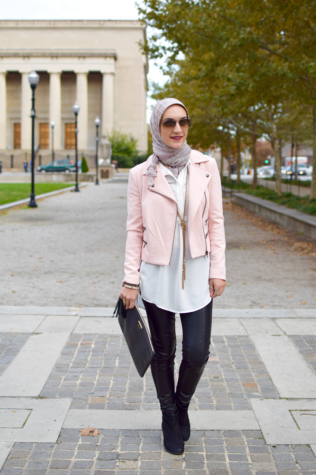 Blazer: Banana Republic (on sale!) / Blouse: Nordstrom Rack / Leggings: Anthropologie / Scarf: c/o Veilure Couture | Boots: Nordstrom / Sunnies: Ray-Ban / Necklace: BaubleBar | Clutch: GiGi NY | Lips: Stila Aria