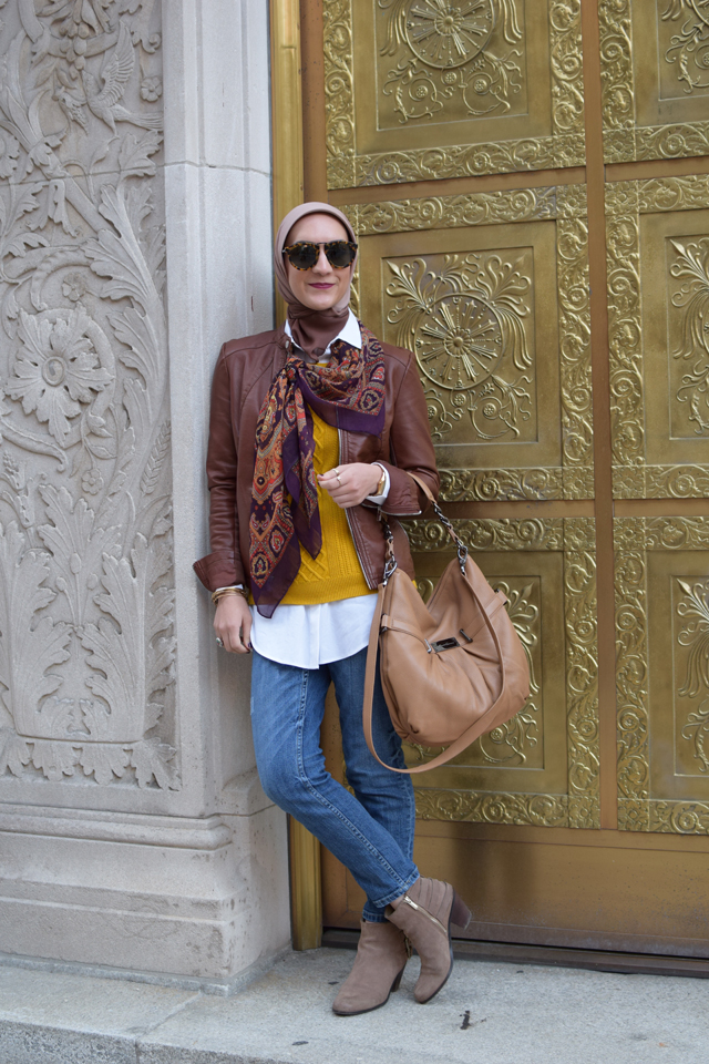 Oversized White Shirt: Loft | Sweater: Banana Republic | Leather Jacket: Express | Jeans: Banana Republic | Scarf: Haute Hijab | Booties: Sam Edelman (similar) | Cross-body Bag (similar) | Neck Scarf: Old but similar here and here | Bangles: Alex and Ani | Sunnies: Karen Walker | Lipstick: Stila Aria