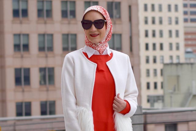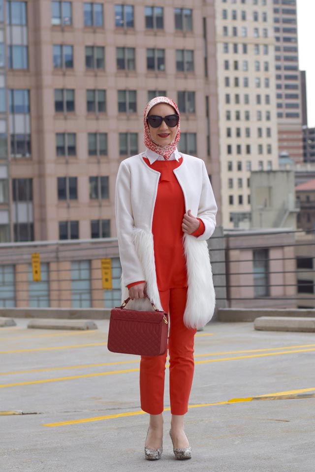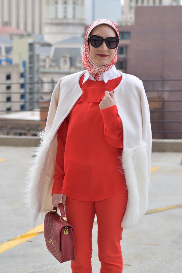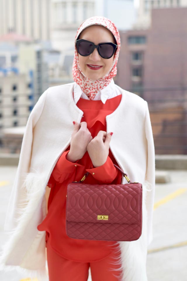 Coat: Chicwish | Blouse: Banana Republic | Pants: Banana Republic | Scarf: Haute Hijab | Shoes: Nordstrom (old but similar) | Bag: J. Crew (similar here and here) | Sunnies: Karen Walker | Lips: Stila Beso