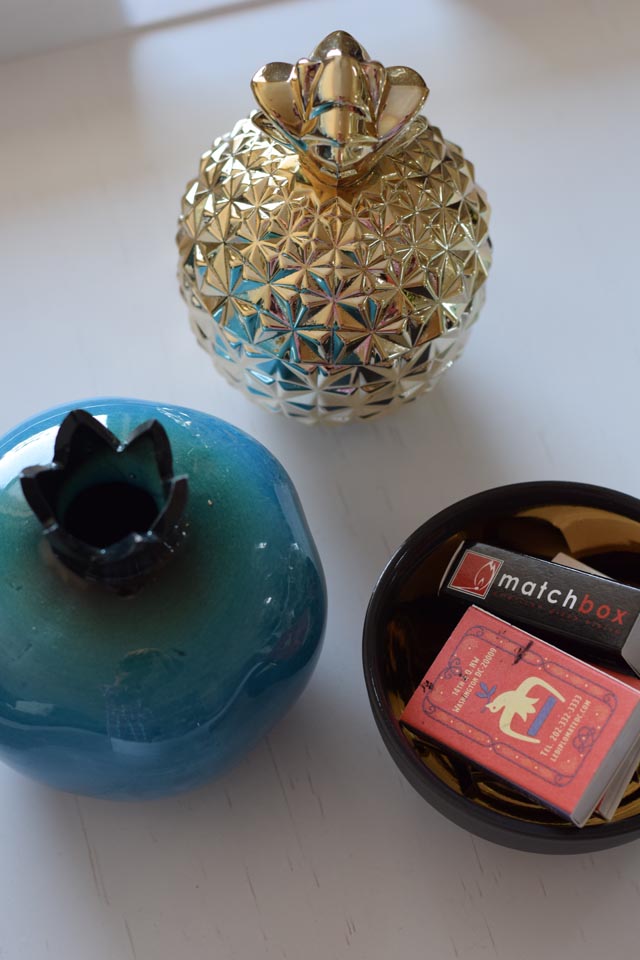 Now for decoration – I wanted to the tray to be decorates tastefully and not super crowded with random stuff. I wanted a few key items; vase for flowers, appetizer plates, dish for matches, candy jar, and decorative items. I’m obsessed with the gold pineapple jar! I keep my favorite Trader Joe gummies in there – which need to be refilled basically every other day! My sister gave me the turquoise pomegranate which pairs perfectly with my fruit theme and color scheme! I always have appetizer plates out on my coffee table – I can’t stand crumbs – and since I’m always eating on the couch it’s a good idea to have a few plates nearby.