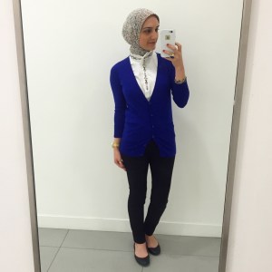Sweater: French Connection | Blouse: Banana Republic | Pants: Banana Republic | Shoes: Sperry | Scarf: Haute Hijab | Necklace: BaubleBar
