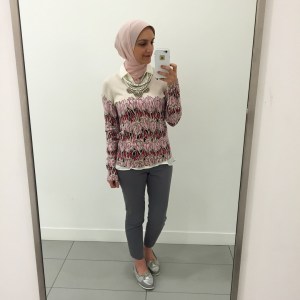 Sweater: French Connection | Blouse: Banana Republic | Pants: Banana Republic | Shoes: Sperry | Scarf: Haute Hijab | Necklace: BaubleBar