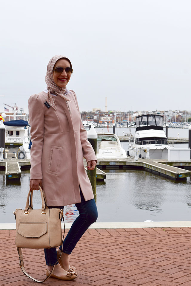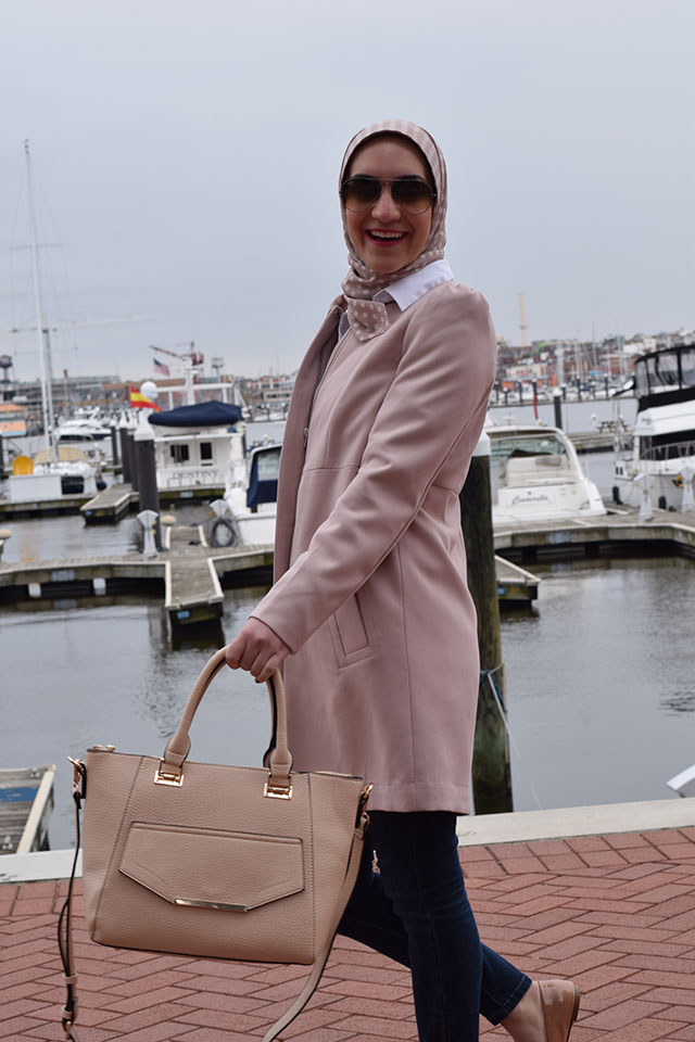 Coat: H&M (old but similar) | Shirt: Ann Taylor | Jeans: Banana Republic | Scarf: Haute Hijab | Bag: c/o Urban Expressions | Flats: J. Crew Factory | Sunnies: Ray-Ban | Lips: Girl About Town