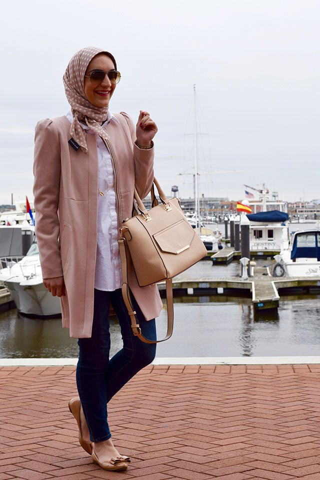 Coat: H&M (old but similar) | Shirt: Ann Taylor | Jeans: Banana Republic | Scarf: Haute Hijab | Bag: c/o Urban Expressions | Flats: J. Crew Factory | Sunnies: Ray-Ban | Lips: Girl About Town