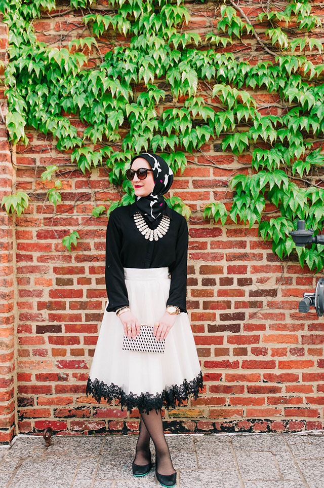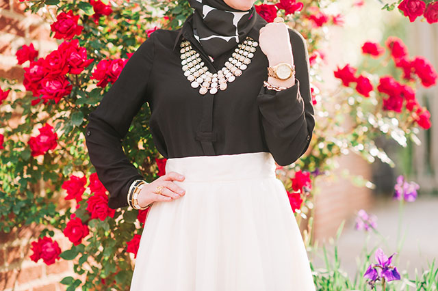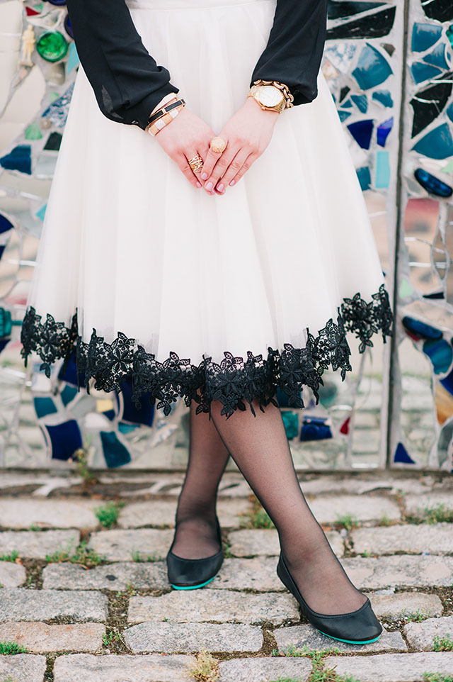 I have a slight obsession with tulle skirts. It may have something to do with always wanting to be a ballerina! Tulle skirts are so feminine and fun to wear! I’ve had this white tulle skirt in my closet for a few years. My mom spruced it up by adding black lace on the bottom and I couldn’t love it more! The lace weighs down the skirt a bit which I love! To have the skirt stand out I paired the skirt with all black and a statement necklace.