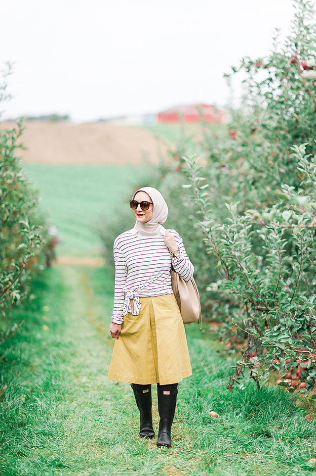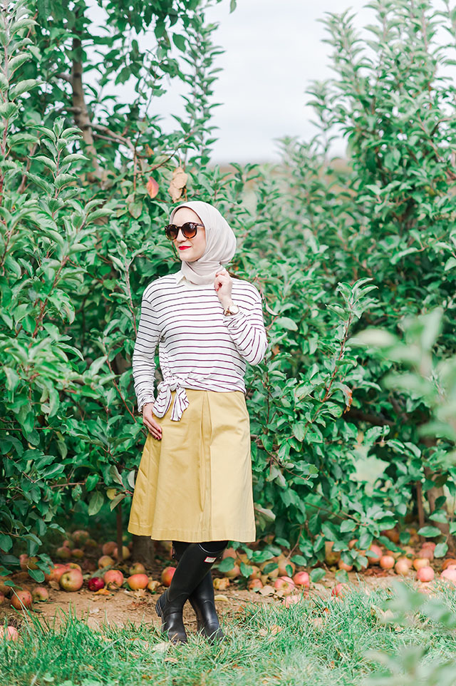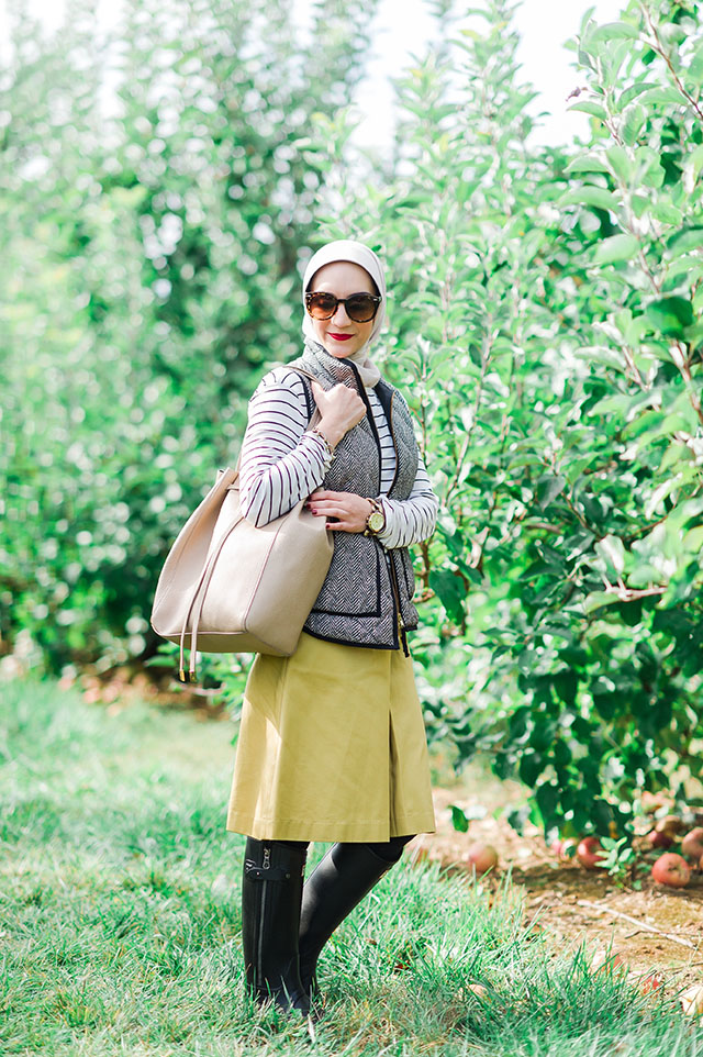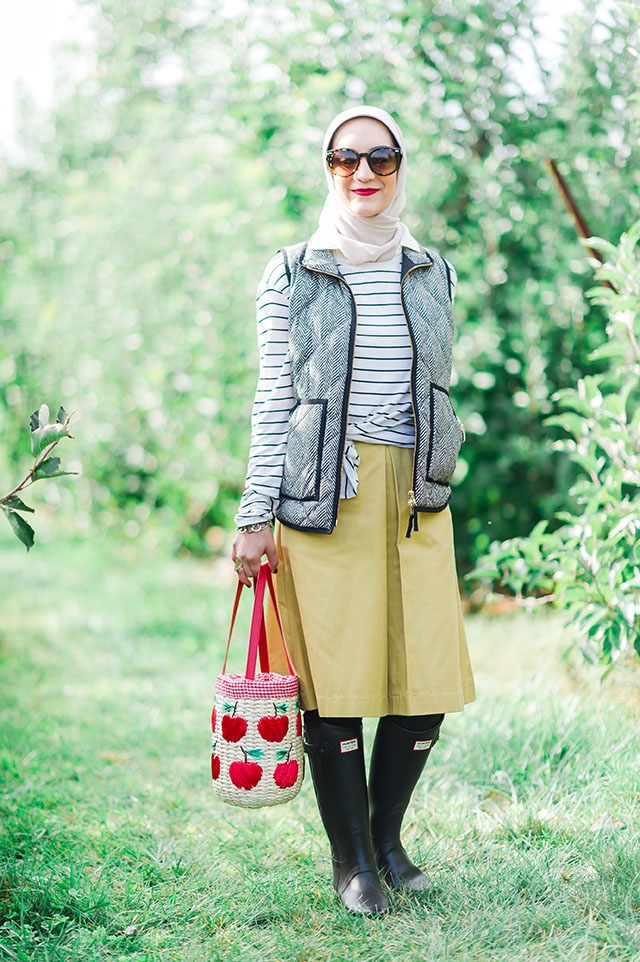 Skirt (old, similar) | Stripe Tee | Vest | Hijab | Tote | Boots | Sunnies | Lips | c/o Apple Tote