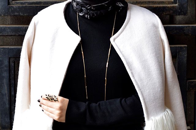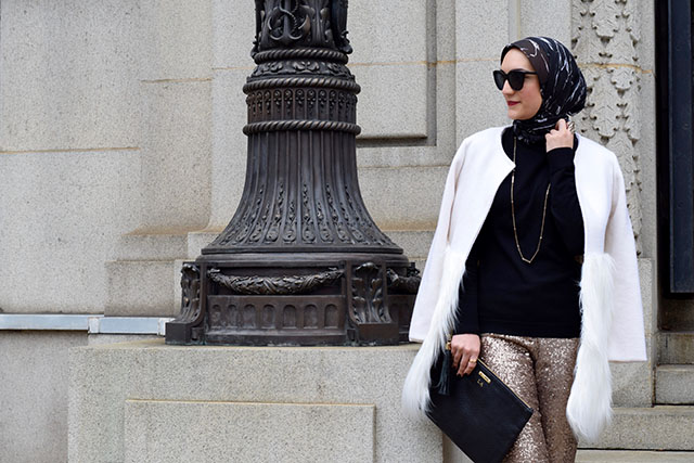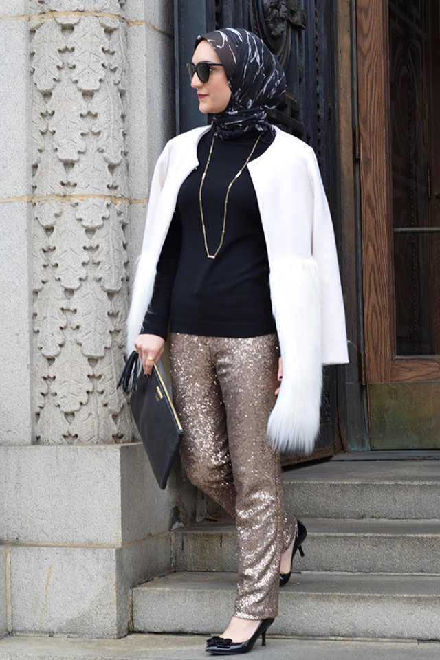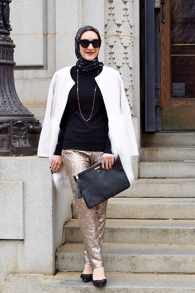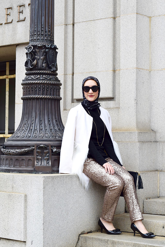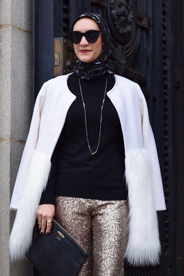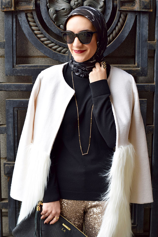 Pants: Ann Taylor (similar, similar) | Sweater: Nordstrom | Coat: Chicwish | Scarf: Haute Hijab | Heels: Nordstrom | Clutch: Gi Gi NY | Sunnies: ASOS | Necklace: House of Harlow | Lips: NARS Audrey