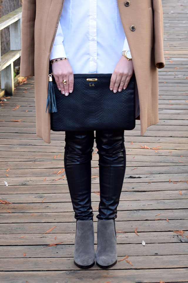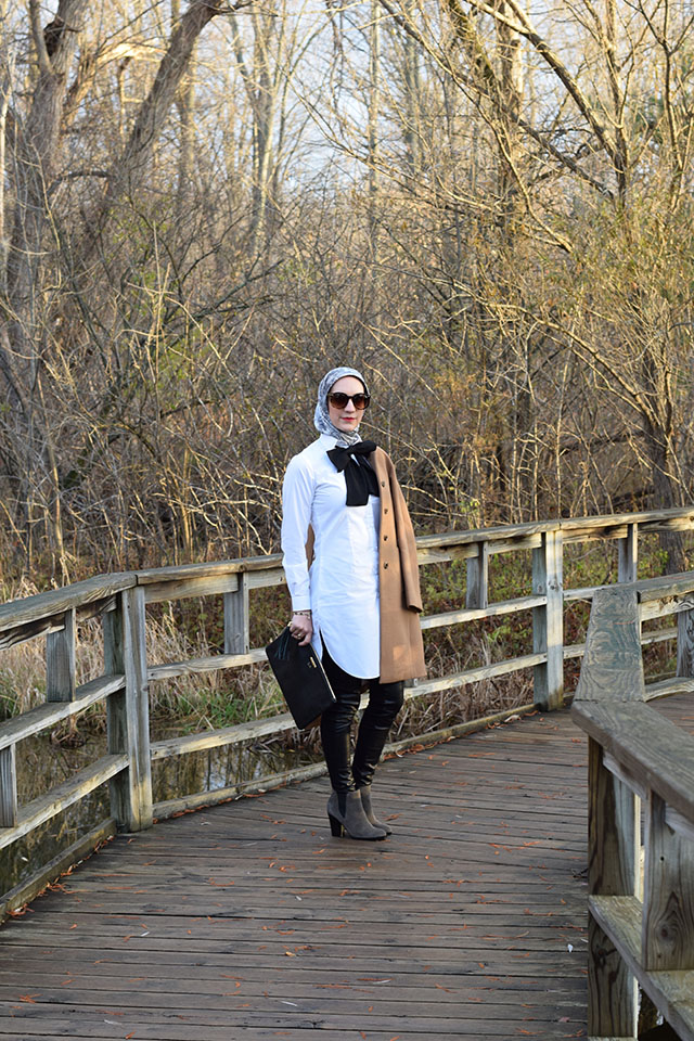 Look 2 // Shirt dress: c/o VED by Melchior | Leggings: Anthropologie | Coat: J. Crew | Boots: Marc Fisher | Bow: ASOS | Scarf: Haute Hijab | Sunnies: ASOS | Clutch: Gi Gi NY | Bracelet: Kendra Scott | Lips: MAC Ruby Woo