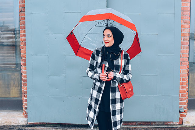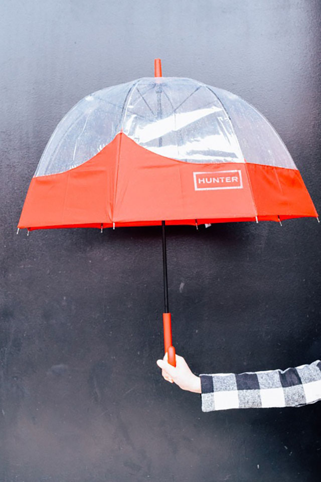 Coat: c/o SheIn | Sweater: Nordstrom | Pants: Banana Republic | Scarf: Vela | Wellies: Hunter | Umbrella: Hunter | Bag: J. Crew | Lips: MAC Ruby Woo