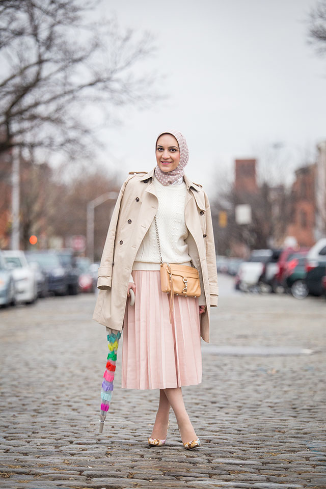 I’m not a huge fan of rainy days but this adorable stripe pastel umbrella has me wishing for more rain! I still hasn’t really snowed here in Baltimore so I’m kind over winter and have given up my dreams of a winter wonderland photoshoot therefore I’ve moved on the pretty pastels! This pleated pink skirt is a great item to have in your closet now and transition to spring. I’ve been styling it with beige booties and a blazer to wear to work, the possibilities are endless.