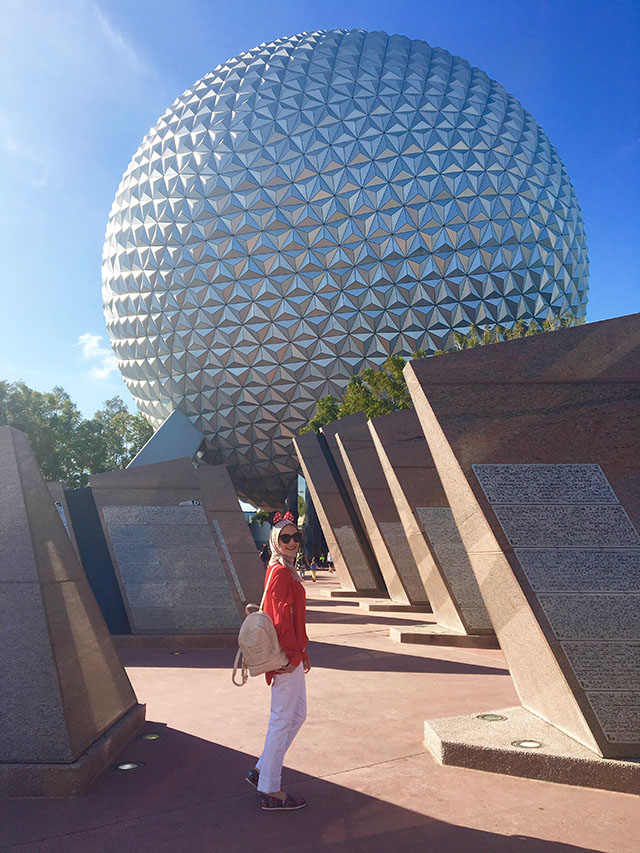 We arrived at the park around 9am and the first thing I did was go to the character spot to get photos with Mickey, Minnie, and Goofy. We didn’t have a fast pass and it took about 30-40minutes. At Epcot you can meet many Disney characters! Many of the Character Meet and Greets take place at the World Showcase. The complete list of characters include Mary Poppins and Alice in Wonderland in United Kingdom, Belle in France, Princess Jasmine in Morocco, Snow White in Germany, Mulan in China, Elsa and Anna in Norway, and Donald Duck in Mexico. Check back on Friday for a detailed post about the Character Experience and how to manage to take photos with all the characters during your day at Epcot!