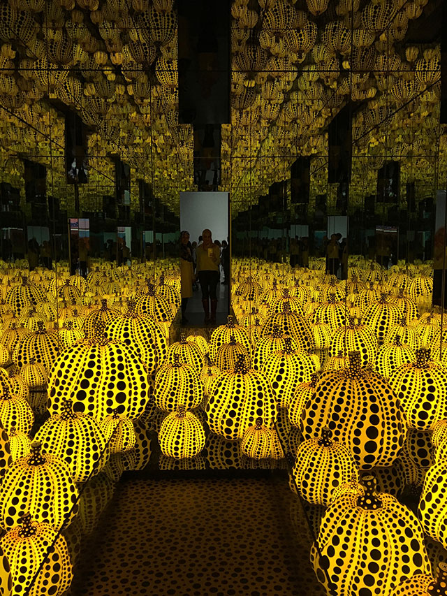 The Infinity Rooms (in order) include Phalli’s Field, The Souls of Millions of Light Years Away, Love Transformed Into Dots, Aftermath of Obliteration of Eternity, and All The Eternal Love I Have For the Pumpkins. Visitors are allowed in groups of 2-3 people in each room for about 20-30 seconds to experience the infinity rooms. My suggestion is to first head straight to the second infinity room, The Souls of Millions of Light Years Away, which is my absolute favorite room! Then head back to Phalli’s Field and enjoy all the other infinity rooms throughout the exhibit.