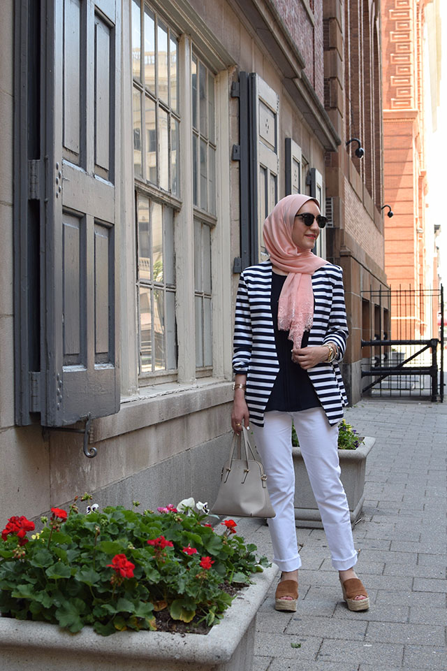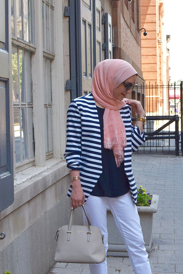 Today’s look is one of my favs. I love throwing a blazer over a blouse and pairing it with y fav denims. It’s an easy, put together off duty look that is bulletproof for looking chic! To add a pop of color to the navy and white look I paired a vibrant coral lace scarf from Veilure Couture. I love this shawl because it is lightweight and perfect for these hot summer days!