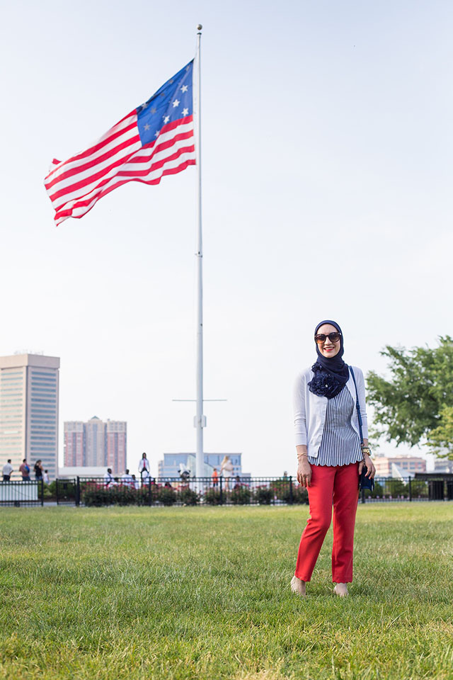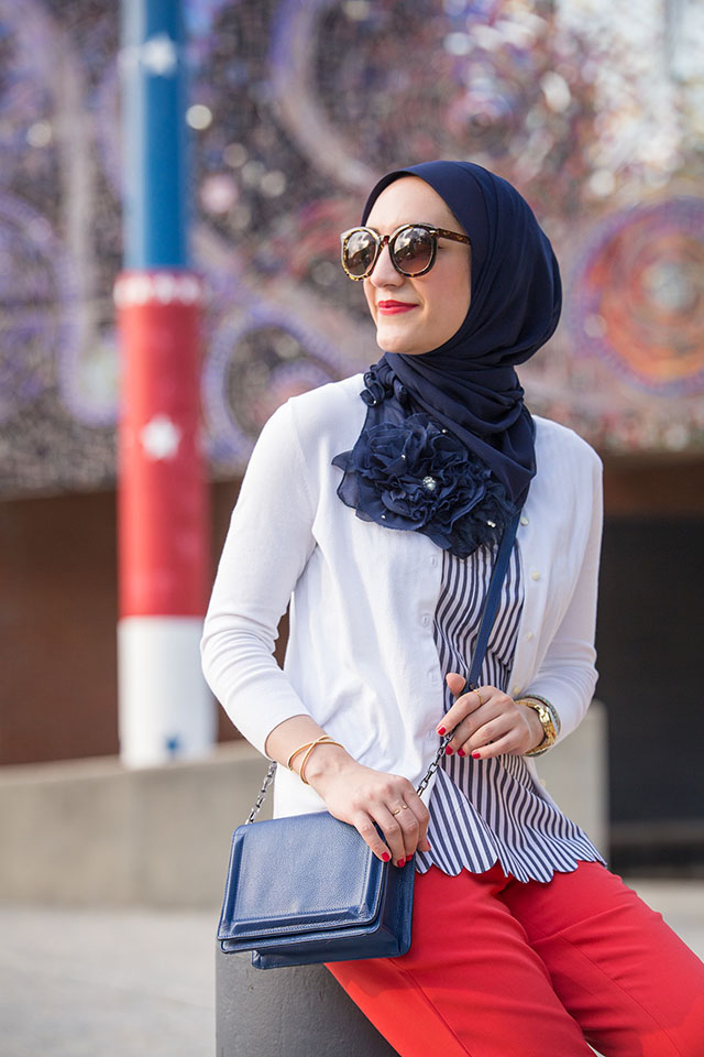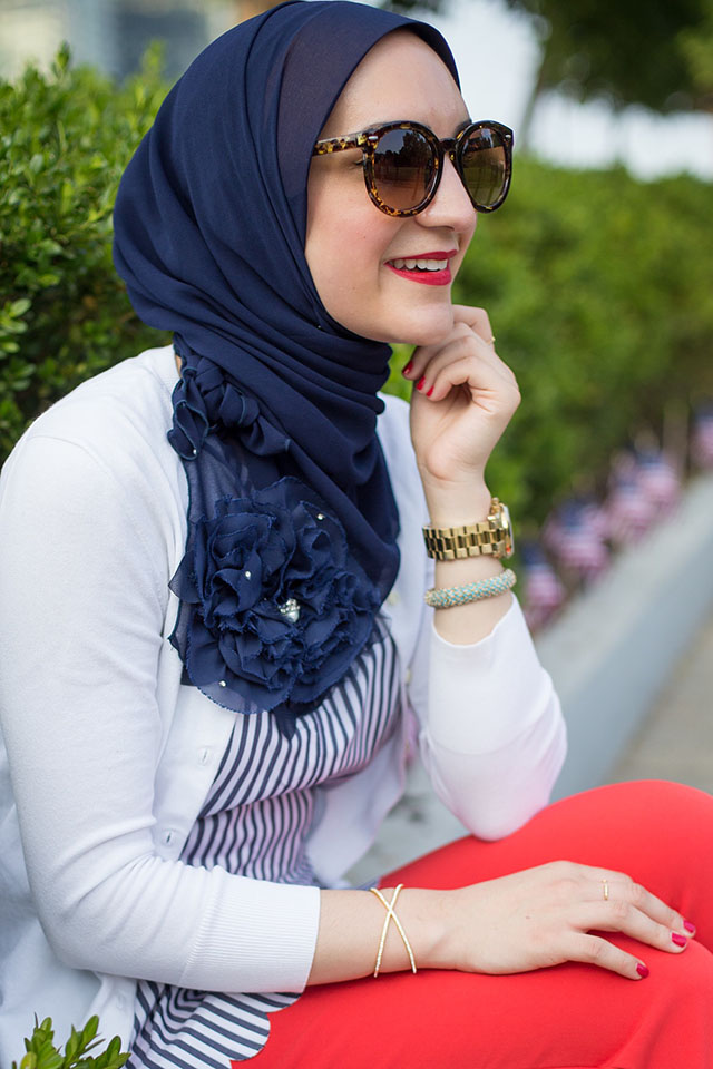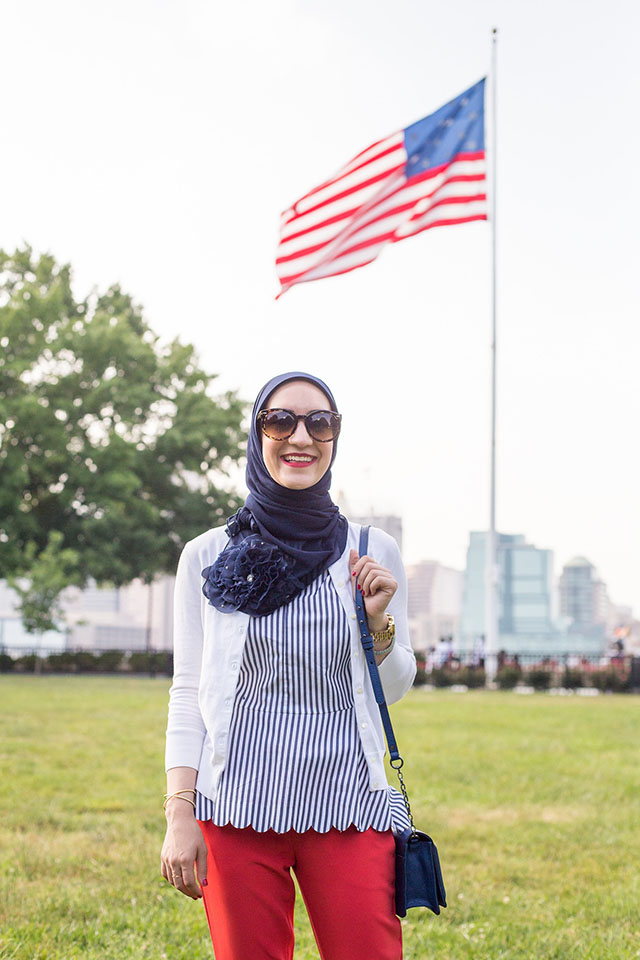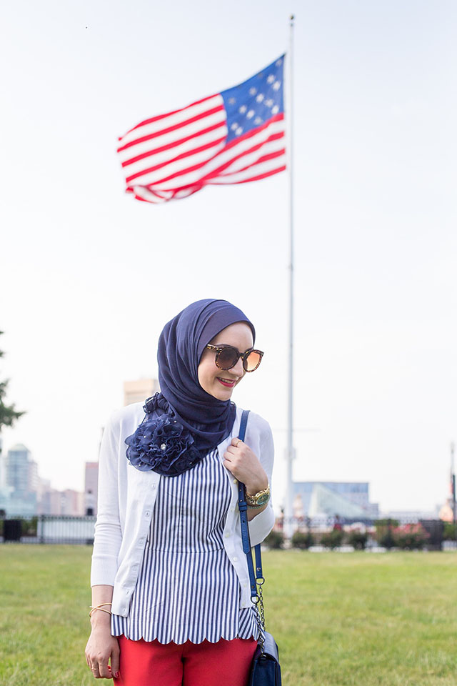 This year I will be traveling on the fourth and may not be able to catch the fireworks – but that’s okay! I’m mostly excited to style some red, white, and blue looks for the holiday weekend. I’ve recently become obsessed with scallop theme clothes and can’t get enough of all the options at Banana Republic. I LOVE these adorable red scallop hemmed pants from BR. I find them extremely versatile to wear to work and dress them up for a night out with stilettos and a cute top. During these warmer days I’ve switched my hijab style to lighter fabrics like this beautiful chiffon scarf from Veilure Couture. I’m definitely packing this beautiful shawl with me for my trip to California next weekend!