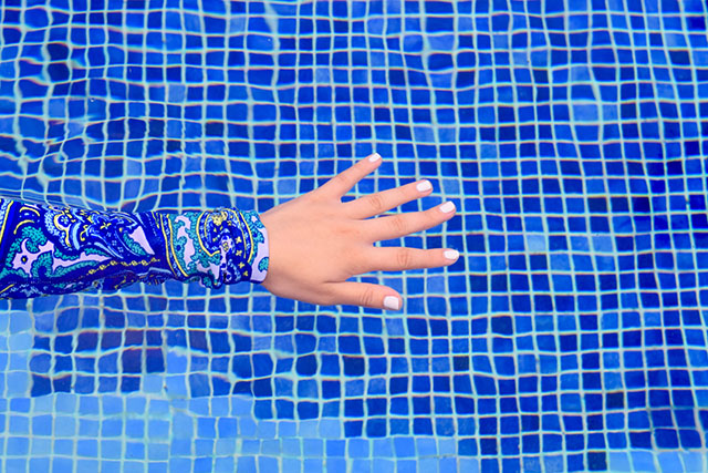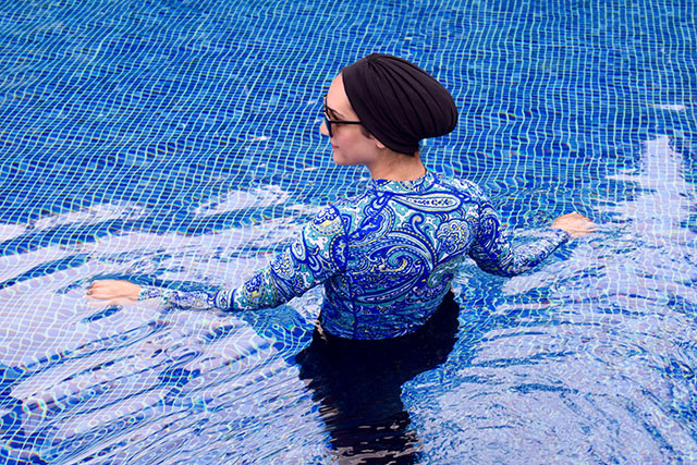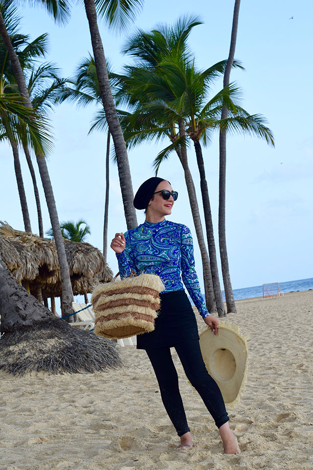 I go with a turban look while swimming. I find it easier and it gives my neck room to breathe or else I feel a bit claustrophobic while in the pool. I have a swim turban that I prefer to wear for water activities. It stays in place and doesn’t budge! I played an intense game of water volleyball with my family and had no issues with it. If I’m just lounging on the beach and don’t plan on getting in the water I go with this turban that is a bit lighter.