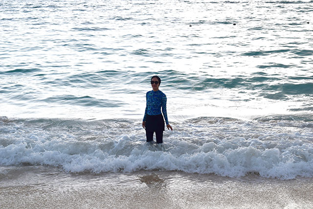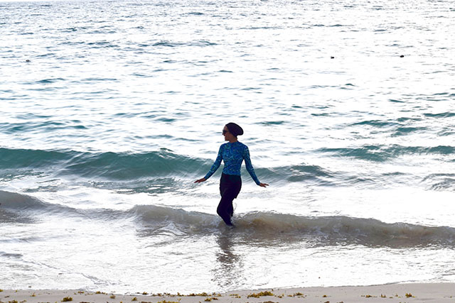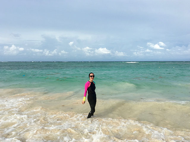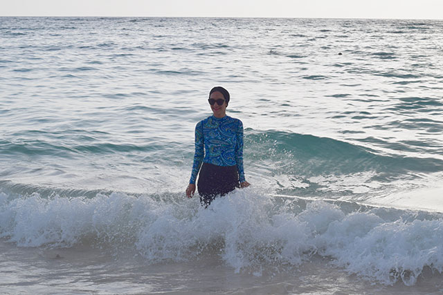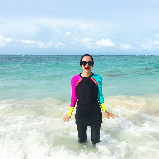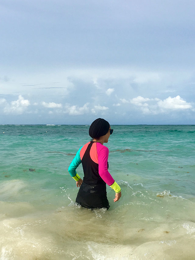 As for the gear that I wear going into the water, I wear a skirted swim bottom from Coolibar paired with a long sleeve rash guard top or a long sleeve one piece bathing suit. I prefer the skirted swim bottoms as opposed to the swim tights because it provides extra coverage. There is also a cropped version of the skirted swim tights as well – I have both! For sizing reference I have XS and S. It is best to have a size down for the tights because once you are in the water you want to make sure it sticks and doesn’t get loose.