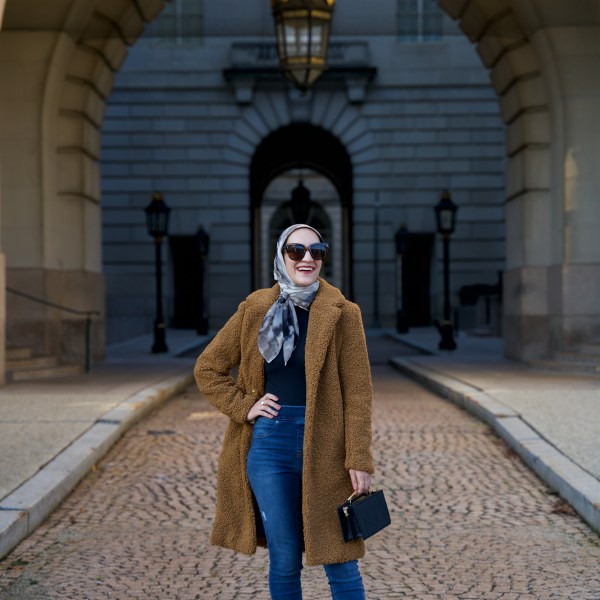 Dress: Banana Republic (sold out, similar) | Cardigan: J. Crew | Flats: M. Gemi | Scarf: Haute Hijab | Bag: c/o Urban Expressions | Sunnies: Ray-Ban