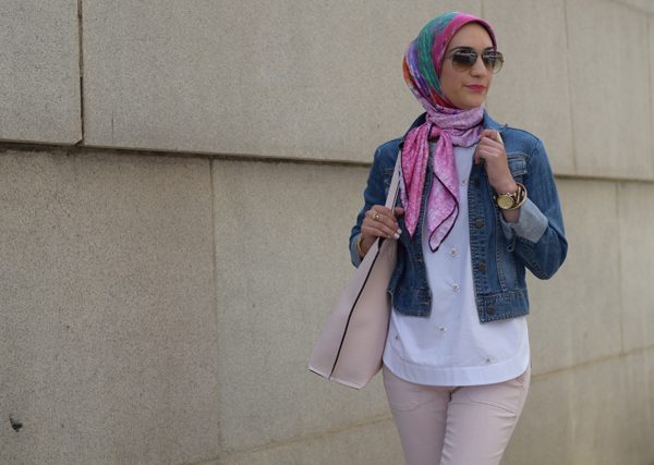 Pants: Banana Republic | Top: J. Crew (old, similar) | Scarf: Haute Hijab | Bag: J. Crew (old, similar) | Shoes: c/o Donald J Pliner | Cuff: Baublebar | Rings: c/o Kendra Scott | Sunnies: Ray-Ban | Lipstick: MAC Ruby Woo