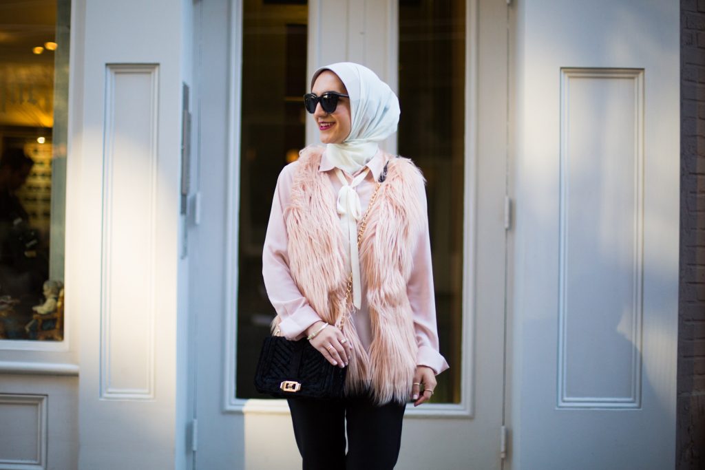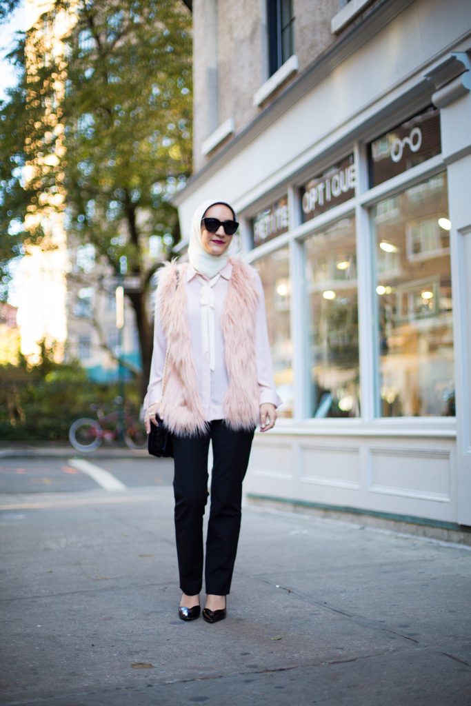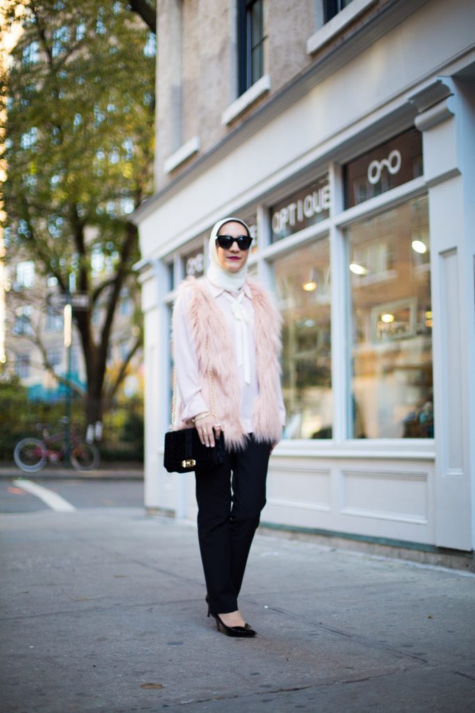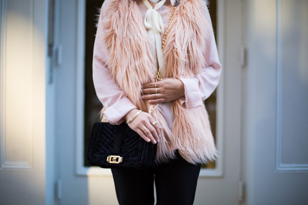 While everyone is reaching for red this holiday season I prefer to add a little blush pink to my look. I paired my favorite black tuxedo trousers with a feminine bow blouse and blush faux fur coat for a holiday look. The vest adds a major dose of texture and perfect for the winter holiday season.