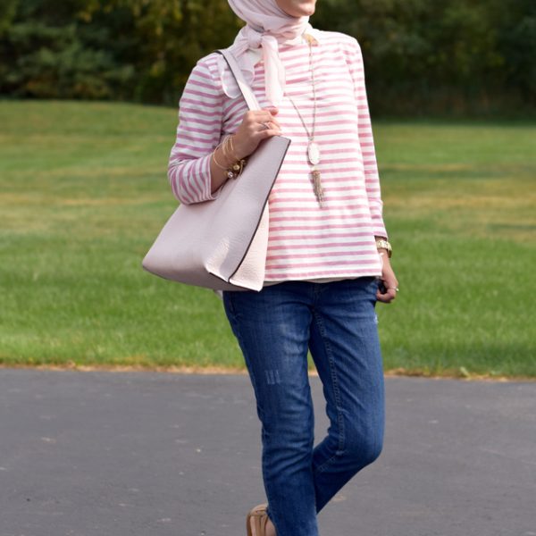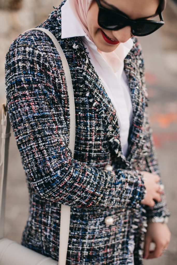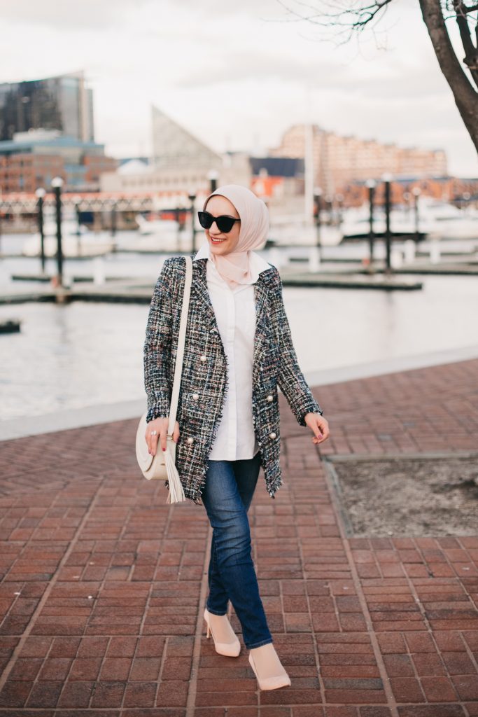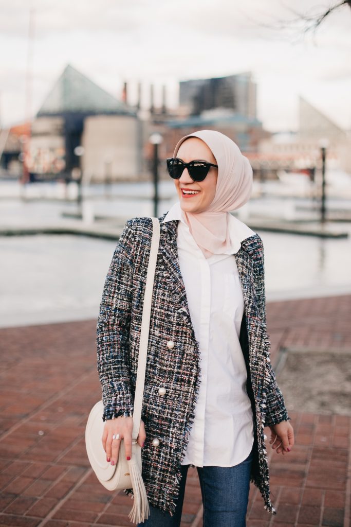 Blazer: SheIn c/o | Shirt: Ann Taylor | Denim: J. Crew | Scarf: Haute Hijab | Heels: Banana Republic | Bag: GiGi NY | Sunnies: Nordstrom | Ring: Kendra Scott c/o | Lipstick: MAC