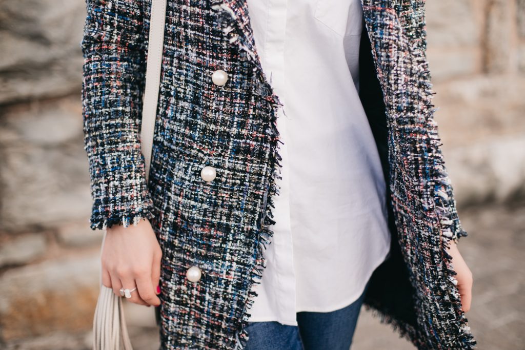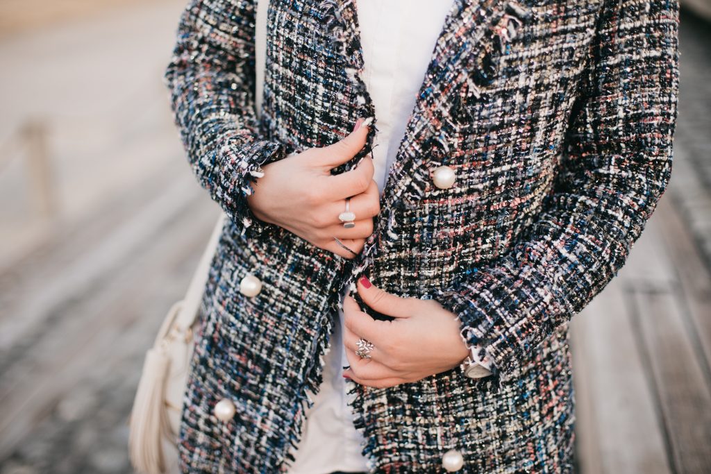 I can never turn down a good blazer! My work wardrobe consists of an array of blazers that I can easily style with pants, skirts, and over dresses. Outside of work I love to dress down my blazers my pairing them with my favorite pair of denim and heels. I instantly fell in love with this tweed blazer because of the feminine pearl button details. The blazer can easily be worn to work, paired with trousers and a blouse, and dressed out when paired with denim or leather pants.