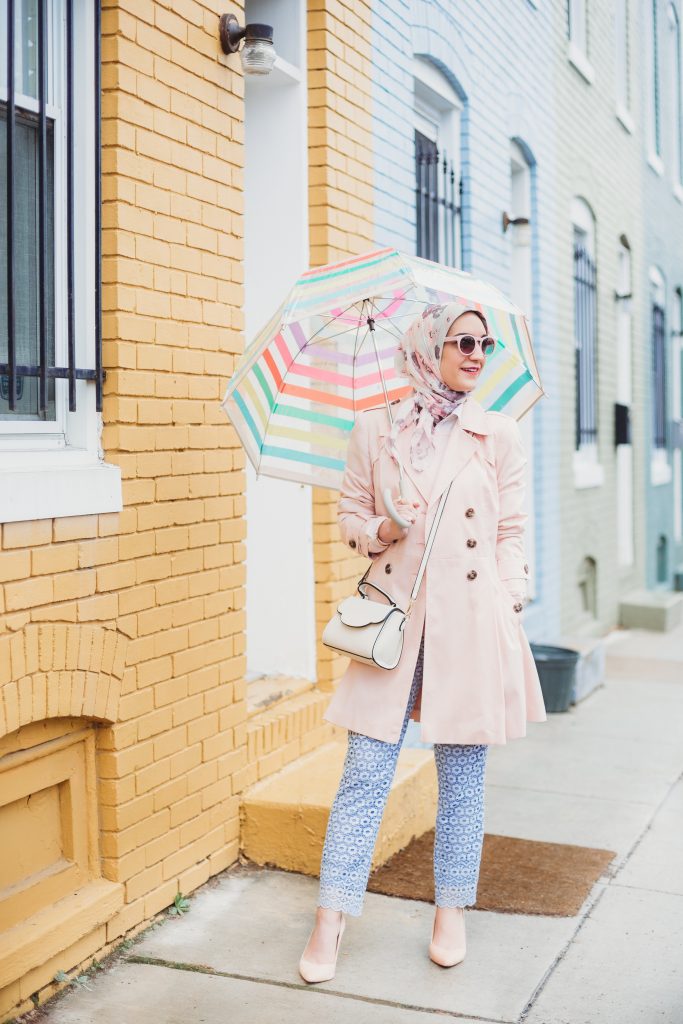 Trench: ASOS | Sweater: Banana Republic | Pant: J. Crew | Hijab: Haute Hijab | Bag: Urban Expressions c/o | Heels: Banana Republic | Sunnies: ASOS | Umbrella: Kate Spade (similar) | Bangle: Kate Spade | Lipstick: MAC