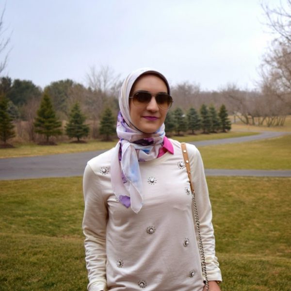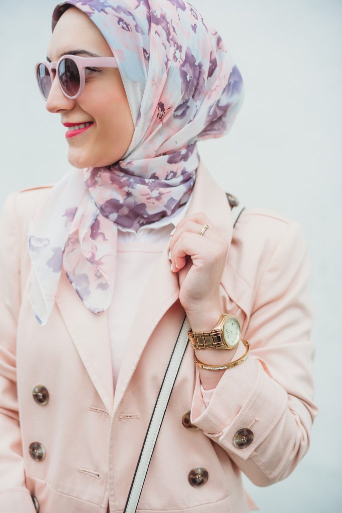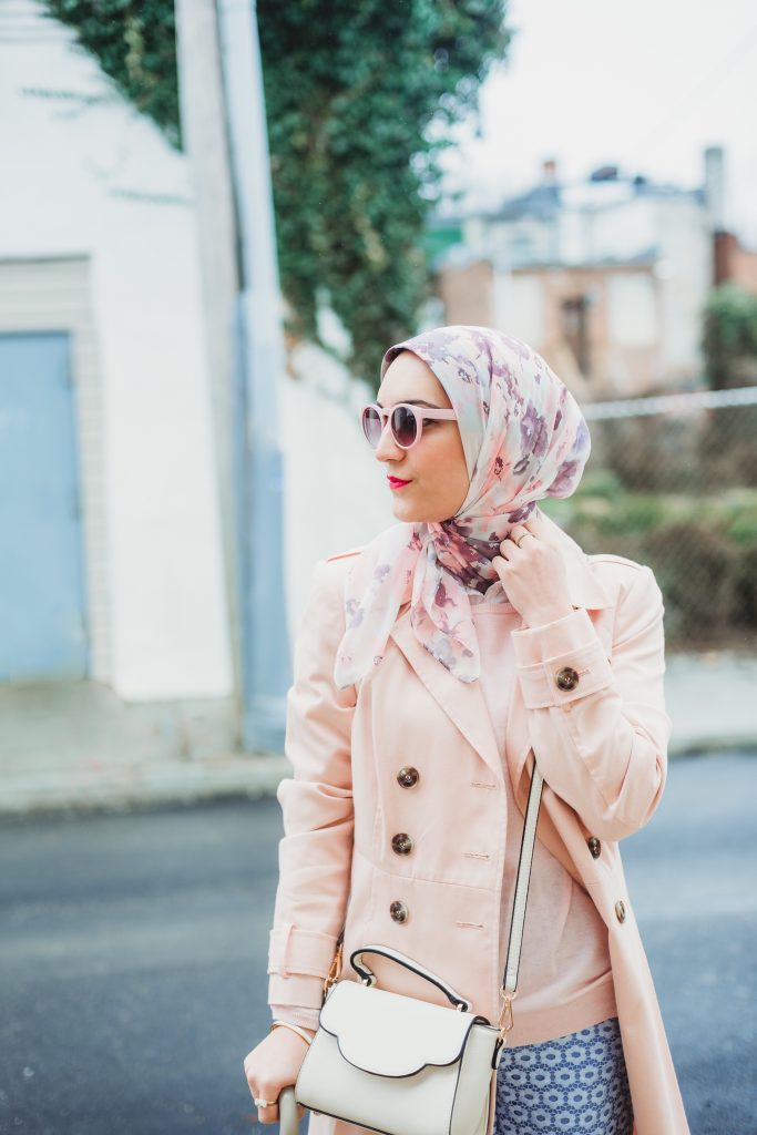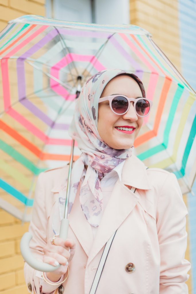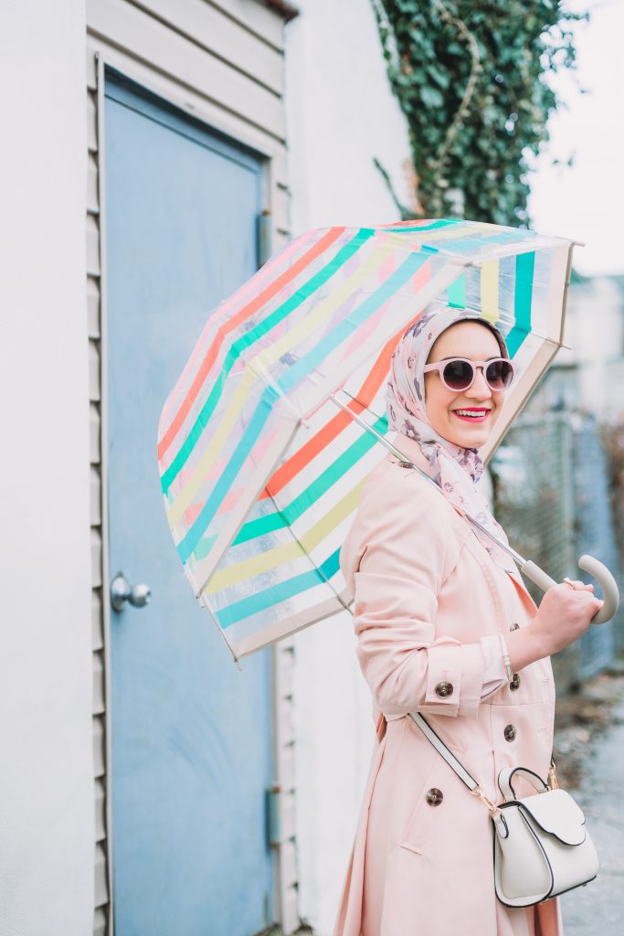 Trench: ASOS | Sweater: Banana Republic | Pant: J. Crew | Hijab: Haute Hijab | Bag: Urban Expressions c/o | Heels: Banana Republic | Sunnies: ASOS | Umbrella: Kate Spade (similar) | Bangle: Kate Spade | Lipstick: MAC