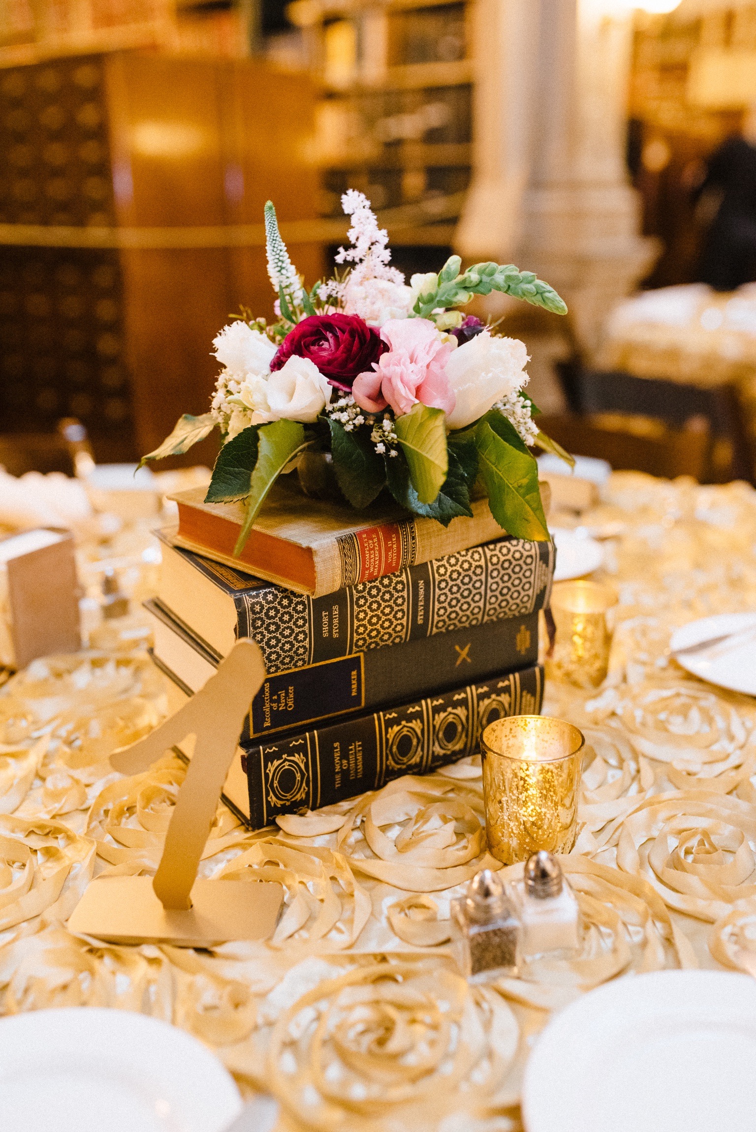 I can’t believe a year has flown by since my sister’s wedding! We had such a blast planning all the details for her big day. My sister was such an easy going bride that she graciously let me live my life long dream of being a wedding planner and assist her in planning for her big day. The wedding was at the gorgeous George Peabody Library in historic Mr. Vernon in Baltimore. The venue is absolutely stunning and such a unique space. To not take away from the venue my sister went with a library theme wedding and chose her decor, flowers, and lights to compliment the venue. If you plan on having your wedding at Peabody I highly recommend you splurge and get the string cafe lights – it makes the entire space very magical!
